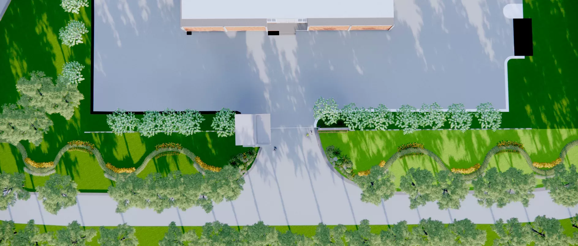Tuyến bồn hoa uốn lượn phía trước được thiết kế như dòng chảy cách điệu, gợi liên tưởng đến chuyển động của nước – yếu tố cốt lõi của trạm bơm. Lớp cây xanh được tổ chức theo cấu trúc nhiều tầng: thảm cỏ nền gọn gàng, dải cây bụi và hoa màu sắc tươi sáng tạo điểm nhấn, kết hợp cây bóng mát trồng theo nhịp đều dọc hàng rào nhằm tăng tính trang trọng và cải thiện vi khí hậu. Hệ tường rào được xử lý bằng mảng xanh đứng xen kẽ các trụ bê tông đứng, tạo nhịp điệu hiện đại, đồng thời tăng độ thông thoáng thị giác.