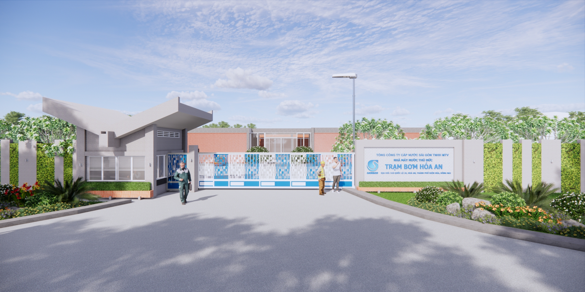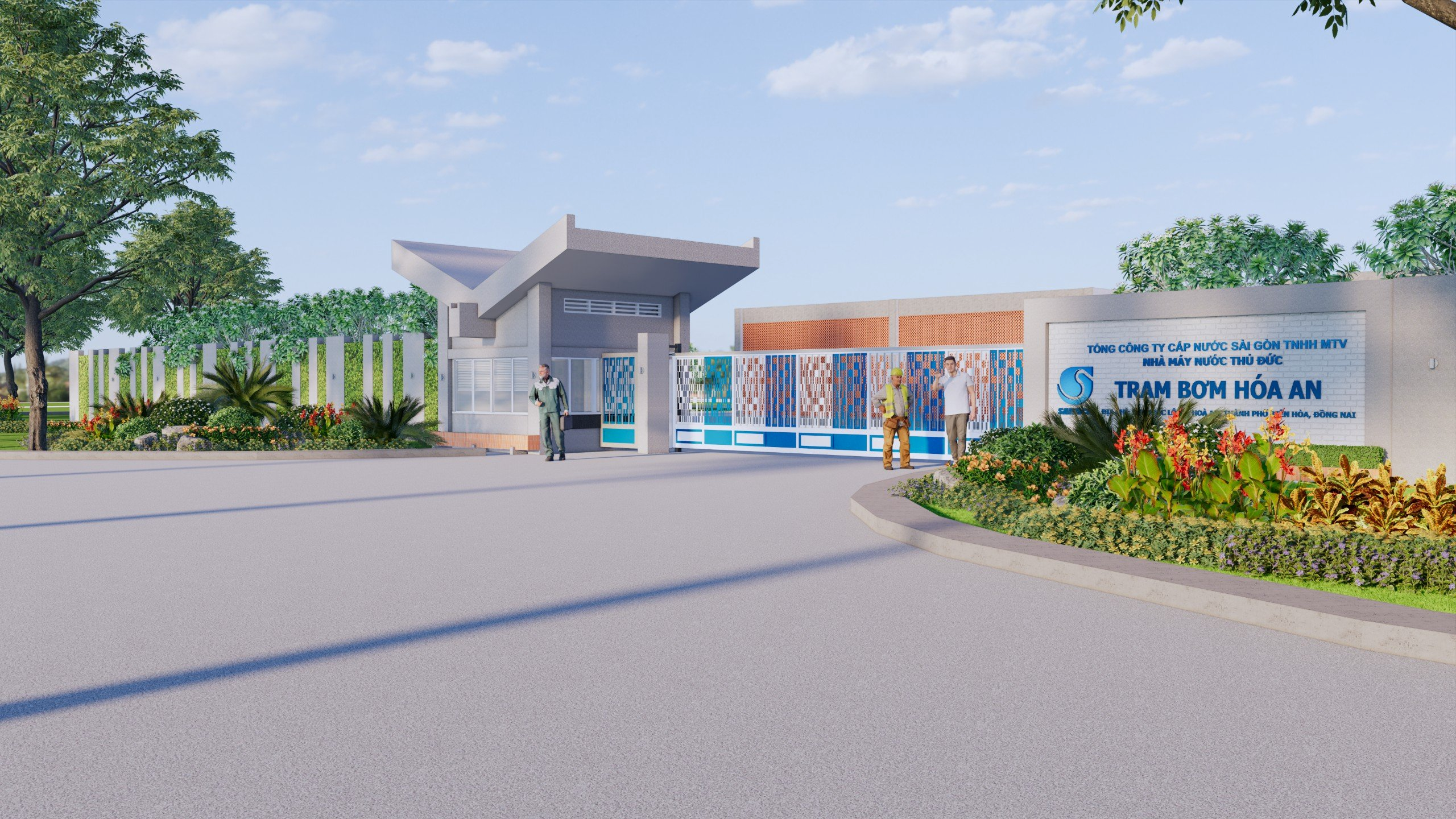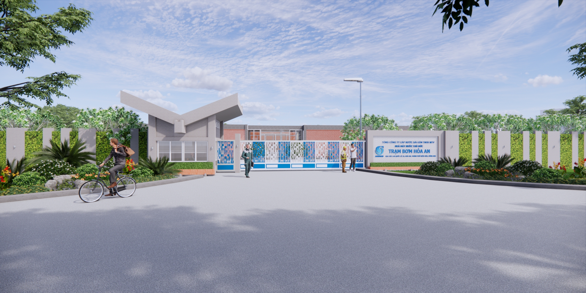 Ý tưởng thiết kế cảnh quan Trạm bơm Hóa An được xây dựng trên tinh thần tôn trọng giá trị hiện hữu – nâng tầm hình ảnh công trình hạ tầng kỹ thuật bằng ngôn ngữ xanh hiện đại. Khối bảo vệ sau giải phóng được giữ nguyên kiến trúc đặc trưng, đóng vai trò như một “ký ức đô thị”, từ đó hệ thống cảnh quan được tổ chức mềm mại bao quanh nhằm làm dịu khối tích công trình và tạo diện mạo thân thiện hơn với cộng đồng.