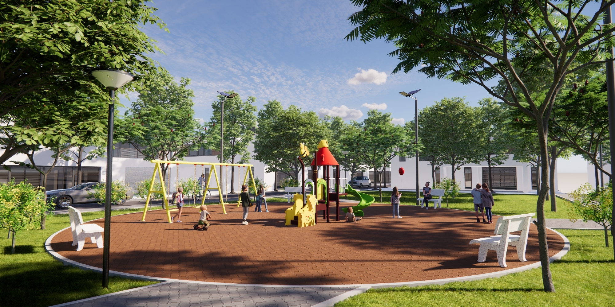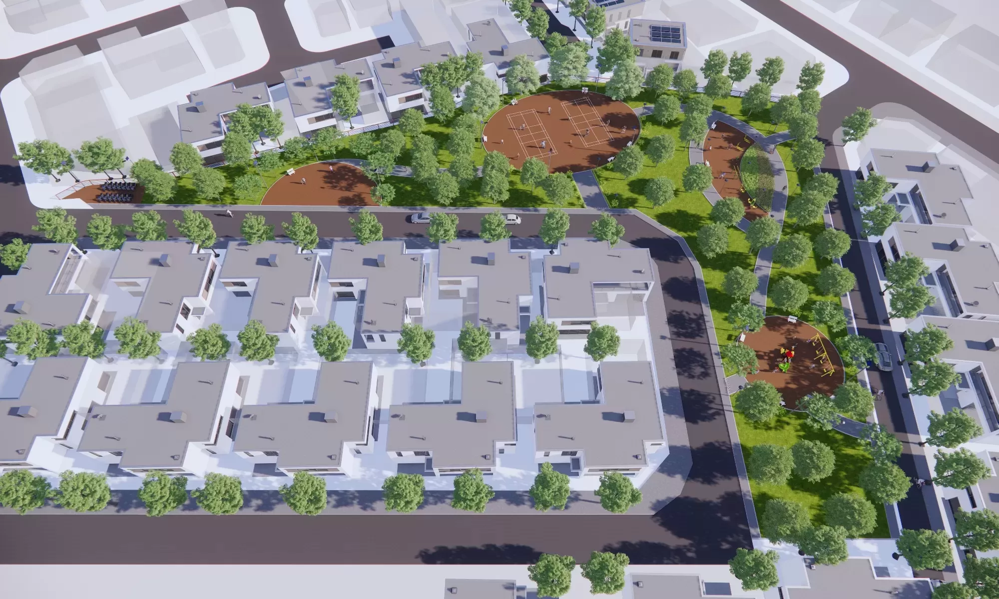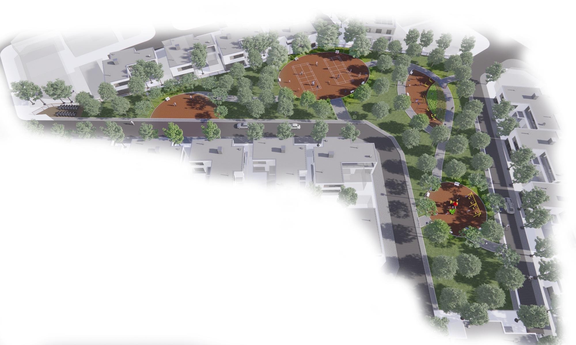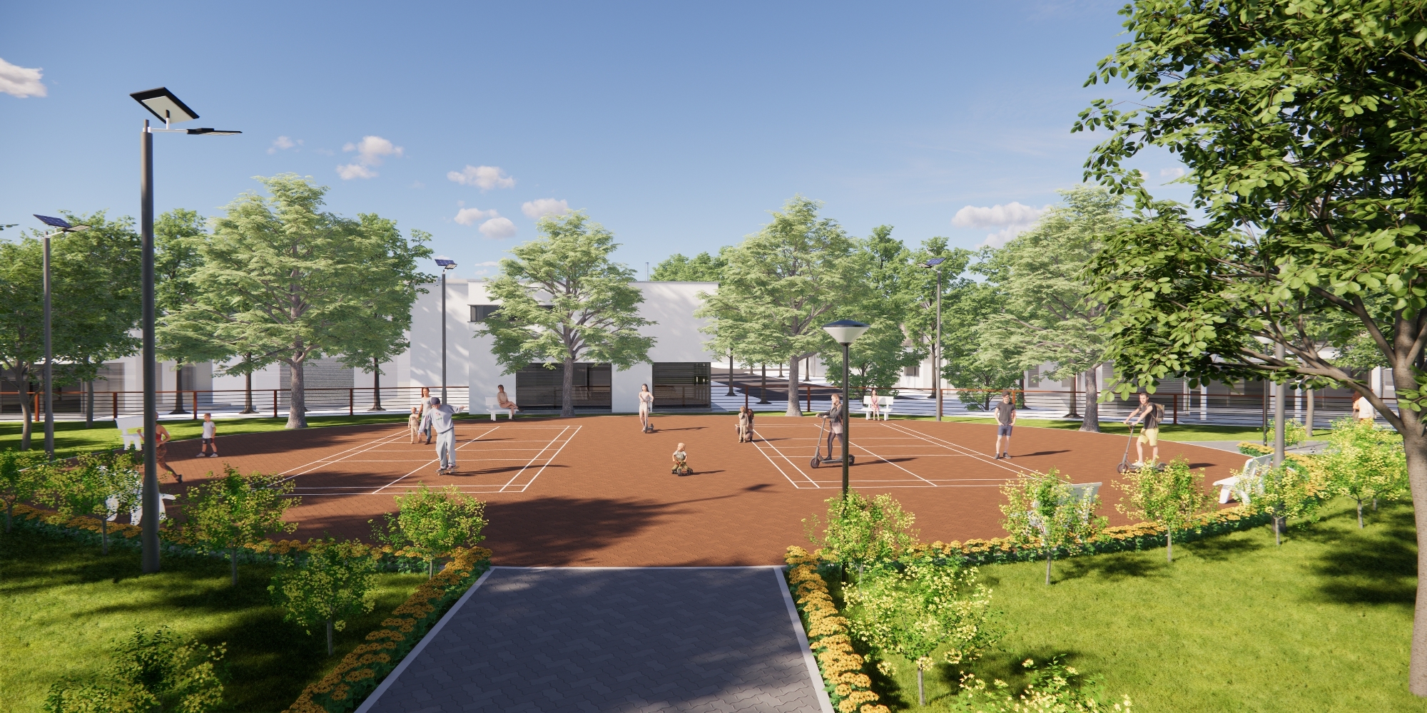 Các phân khu chức năng được tổ chức mềm mại theo đường cong tự nhiên, nổi bật với cụm sân thể thao đa năng, khu vui chơi trẻ em sinh động và các khoảng đệm cây xanh rợp bóng. Hệ thống lối dạo uốn lượn liên kết xuyên suốt, khuyến khích trải nghiệm đi bộ và tương tác xã hội. Thảm thực vật được lựa chọn theo hướng bền vững, phù hợp khí hậu nhiệt đới, góp phần cải thiện vi khí hậu và tạo cảnh quan xanh mát quanh năm.