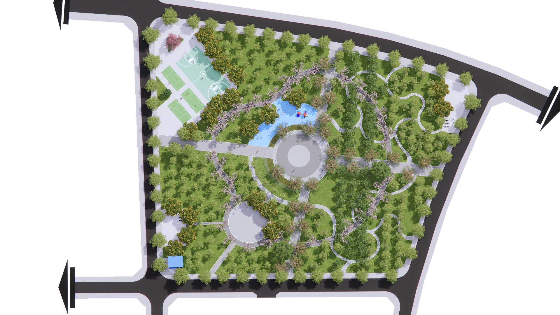 Thiết kế công viên P. Phước Long hướng đến một không gian xanh đa chức năng, nơi thiên nhiên và con người giao hòa. Bố cục không gian được tổ chức theo các vòng tròn trung tâm kết hợp hệ lối dạo uốn lượn, tạo nên dòng chảy liên tục, khuyến khích di chuyển và khám phá. Quảng trường trung tâm là điểm nhấn sinh hoạt cộng đồng, liên kết linh hoạt với khu vui chơi trẻ em, sân thể thao và các không gian nghỉ ngơi dưới tán cây.
