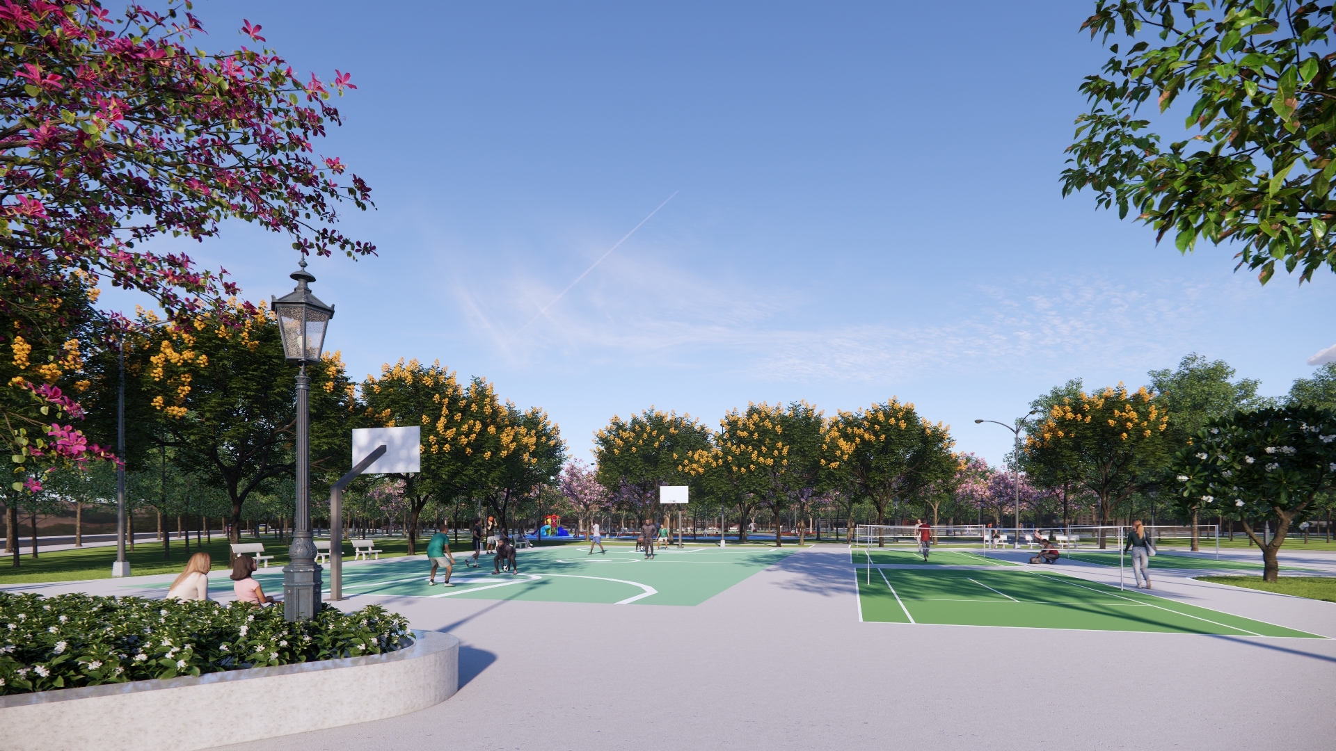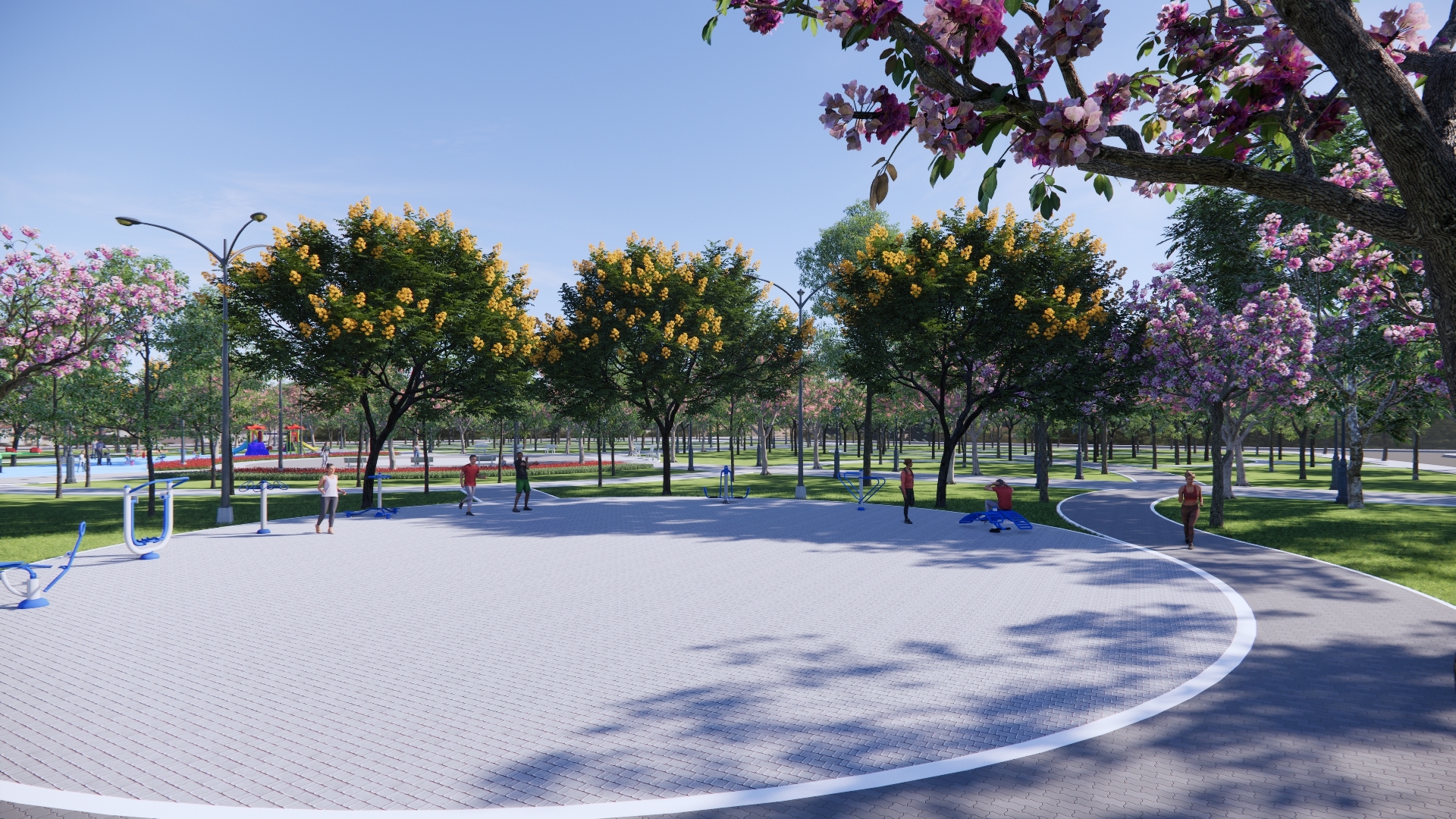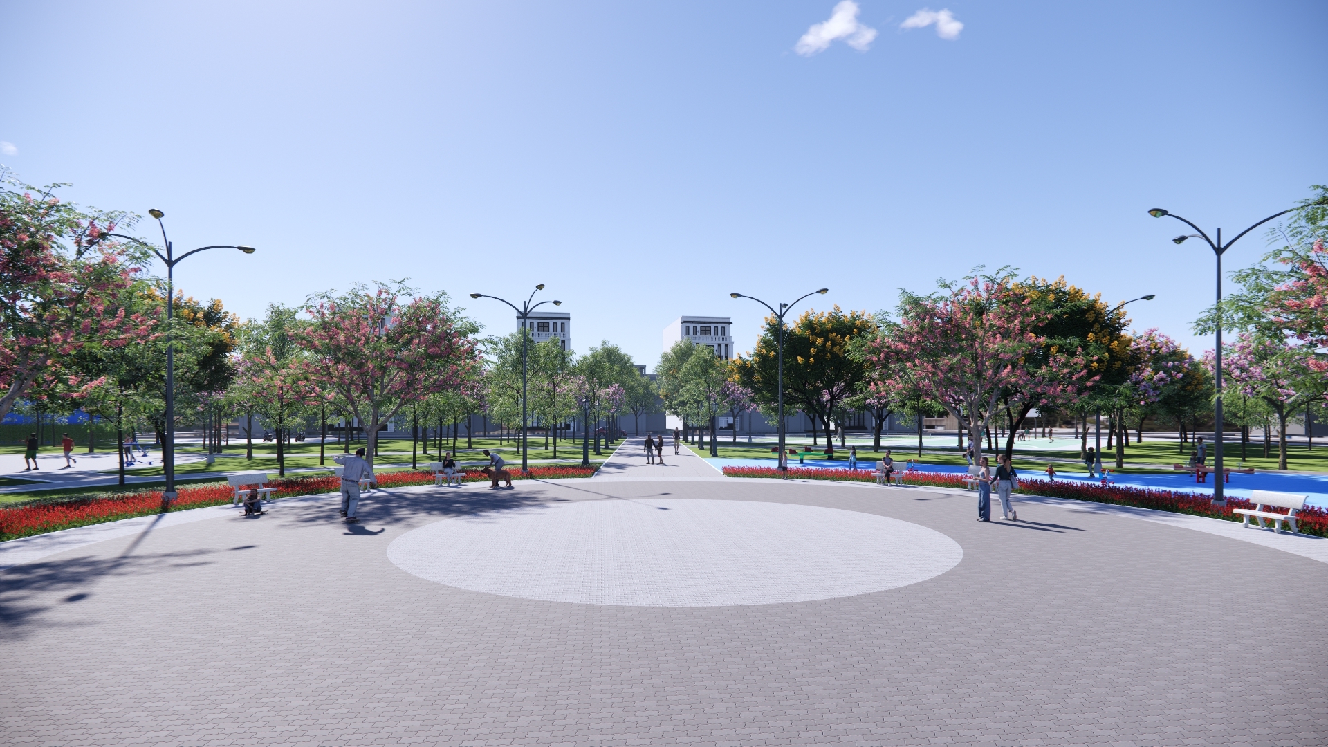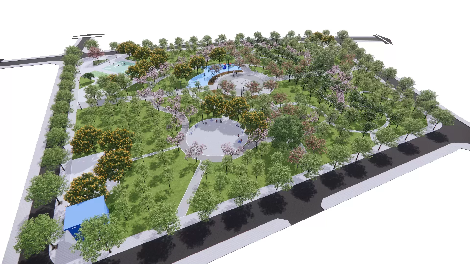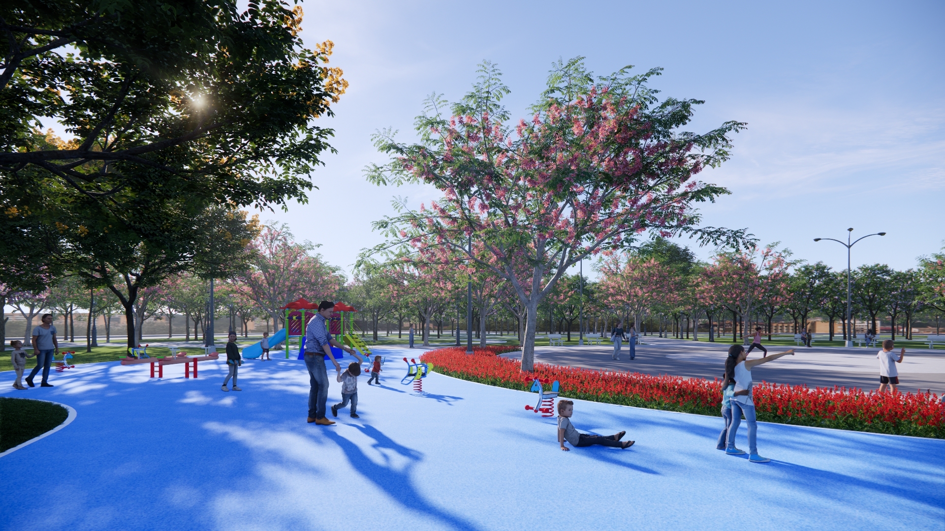 Hệ thực vật được lựa chọn đa tầng, ưu tiên các loài cây bóng mát xen kẽ cây hoa theo mùa, mang lại sắc thái cảnh quan sinh động quanh năm và cải thiện vi khí hậu đô thị. Thảm cỏ mở, vườn hoa và dải cây xanh bao quanh không chỉ tạo lớp đệm sinh thái mà còn góp phần giảm ồn, lọc bụi và tăng cường trải nghiệm thư giãn. Ngôn ngữ thiết kế hiện đại, thân thiện và dễ tiếp cận giúp công viên trở thành điểm đến gần gũi cho mọi lứa tuổi—một không gian xanh bền vững, nơi cộng đồng gặp gỡ, vui chơi và tái tạo năng lượng mỗi ngày.