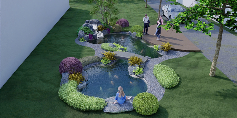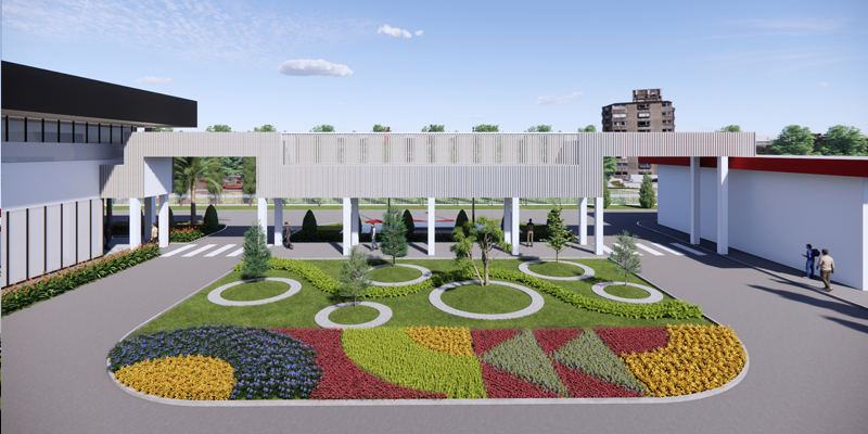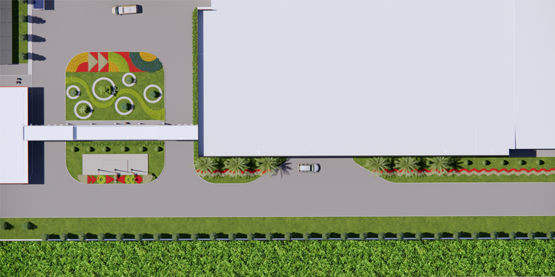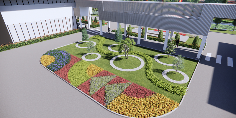 Khu vực cổng chính được tổ chức như một không gian nhận diện thương hiệu mạnh mẽ với thảm hoa hình học sắc đỏ – vàng – xanh đặc trưng, kết hợp hệ cây bóng mát và hàng chà là tạo nhịp điệu trang trọng. Các bồn cây tròn đan xen trên thảm cỏ thể hiện sự kết nối – lan tỏa, đồng thời tối ưu tầm nhìn và giao thông nội bộ.