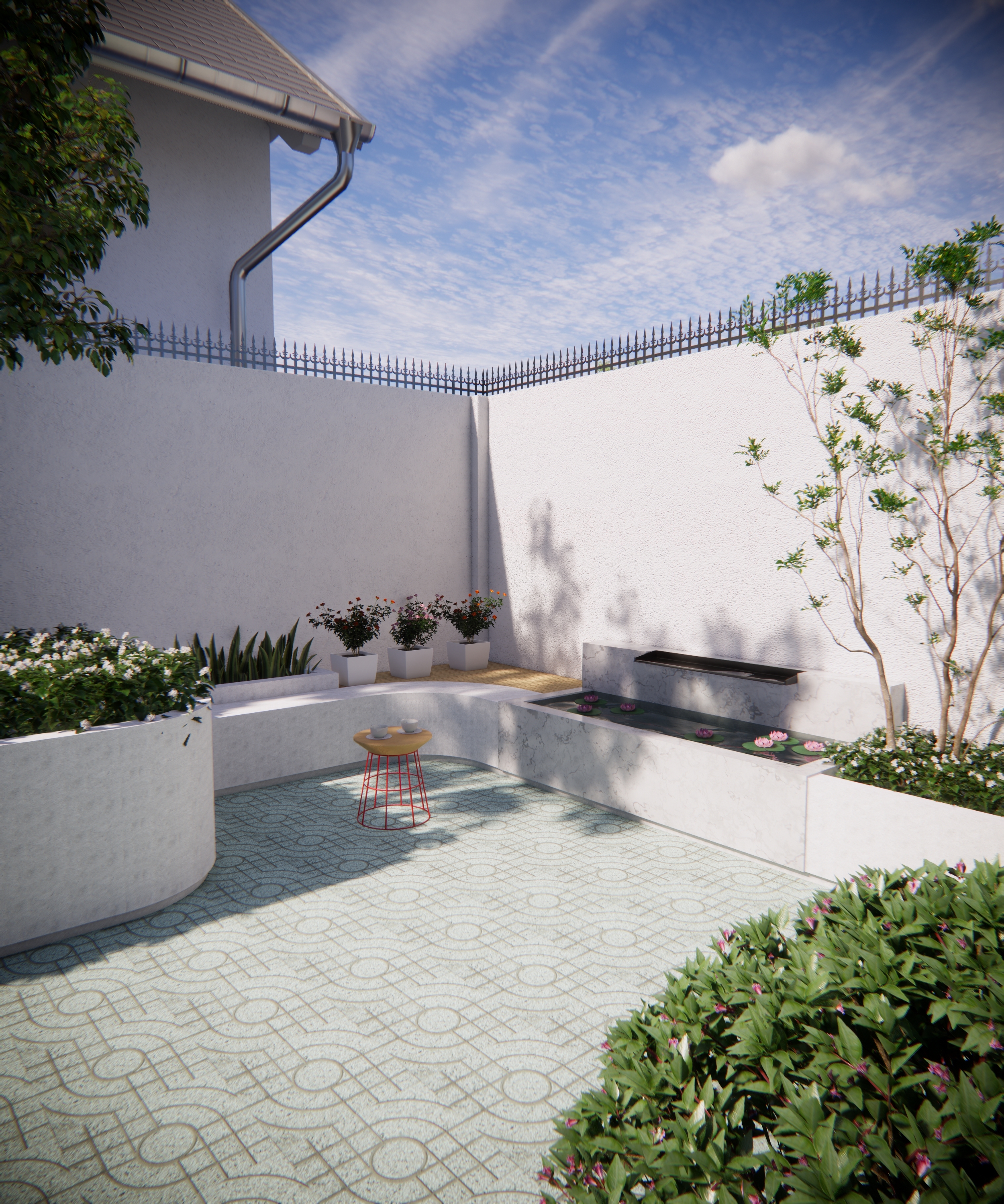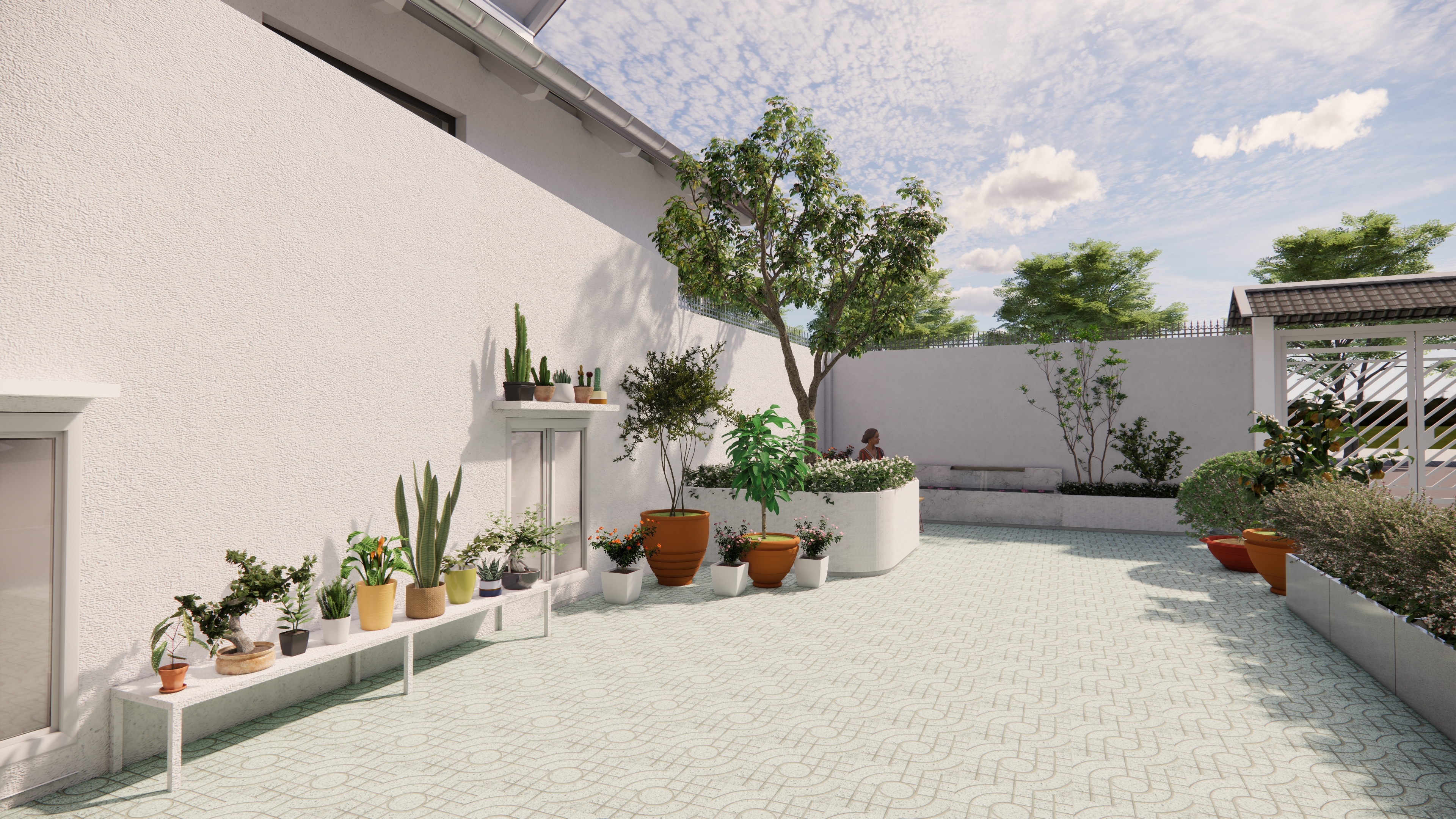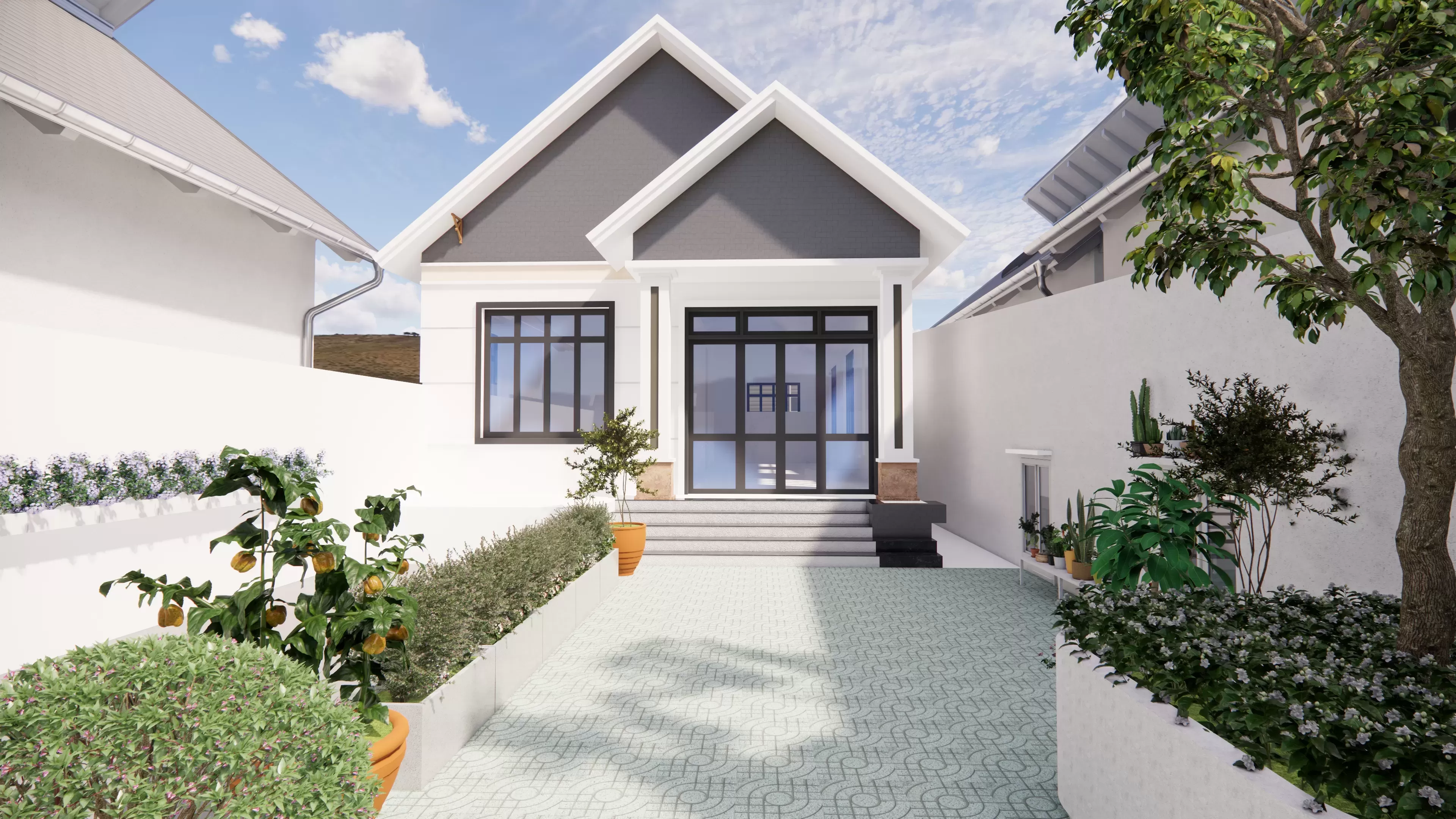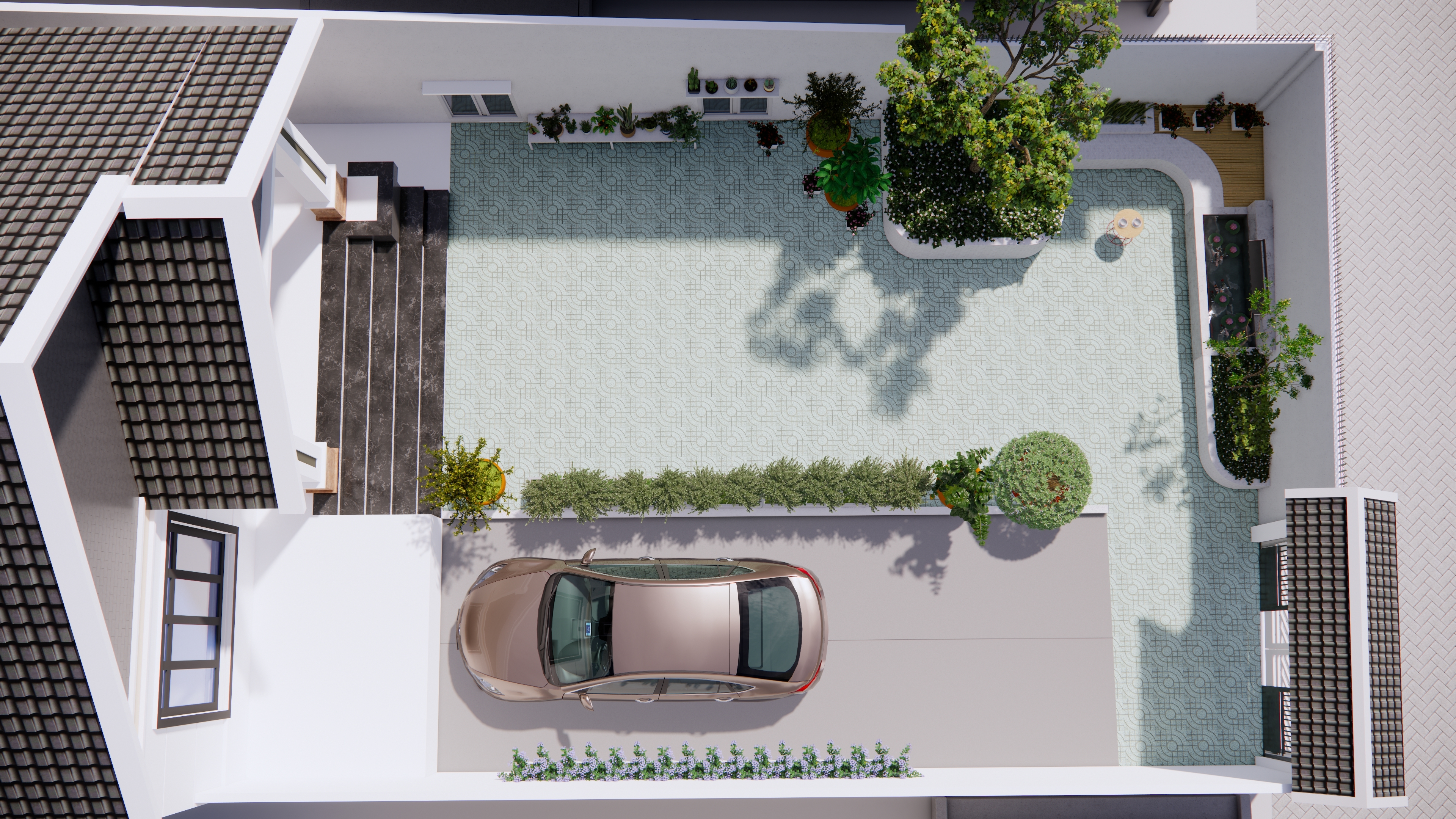 Lấy cảm hứng từ tinh thần “vườn trong phố”, sân vườn nhà chị Quyên tại Thủ Đức được tổ chức như một khoảng thở xanh riêng tư, nơi kiến trúc và thiên nhiên giao hòa tinh tế. Ngôn ngữ thiết kế theo hướng tối giản hiện đại, với nền lát họa tiết nhẹ nhàng tạo nhịp điệu thị giác, dẫn lối từ cổng vào đến hiên nhà.