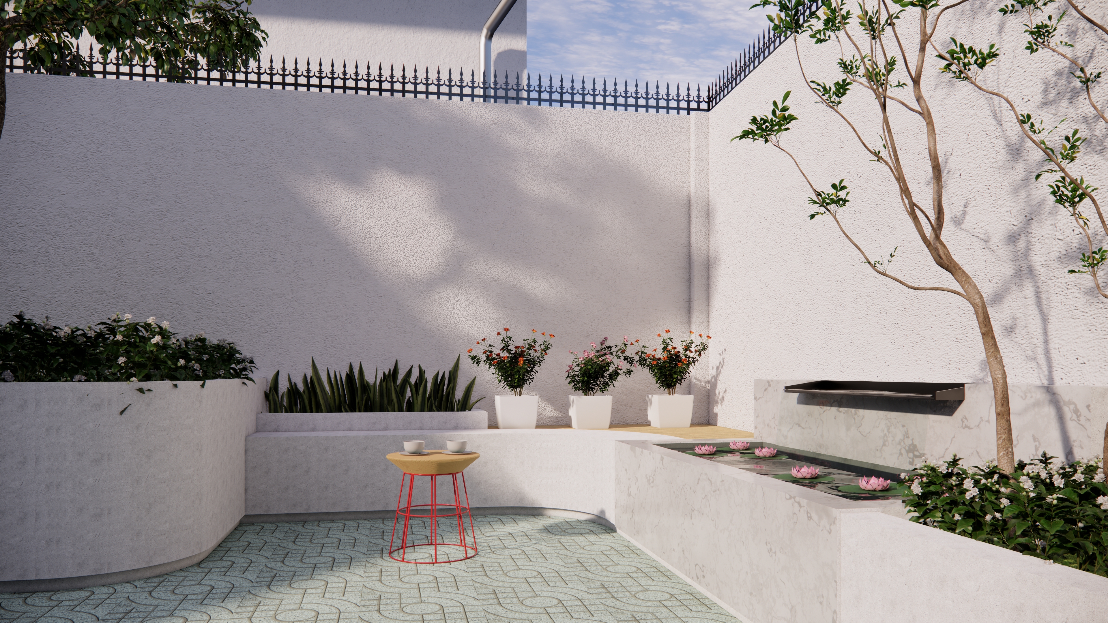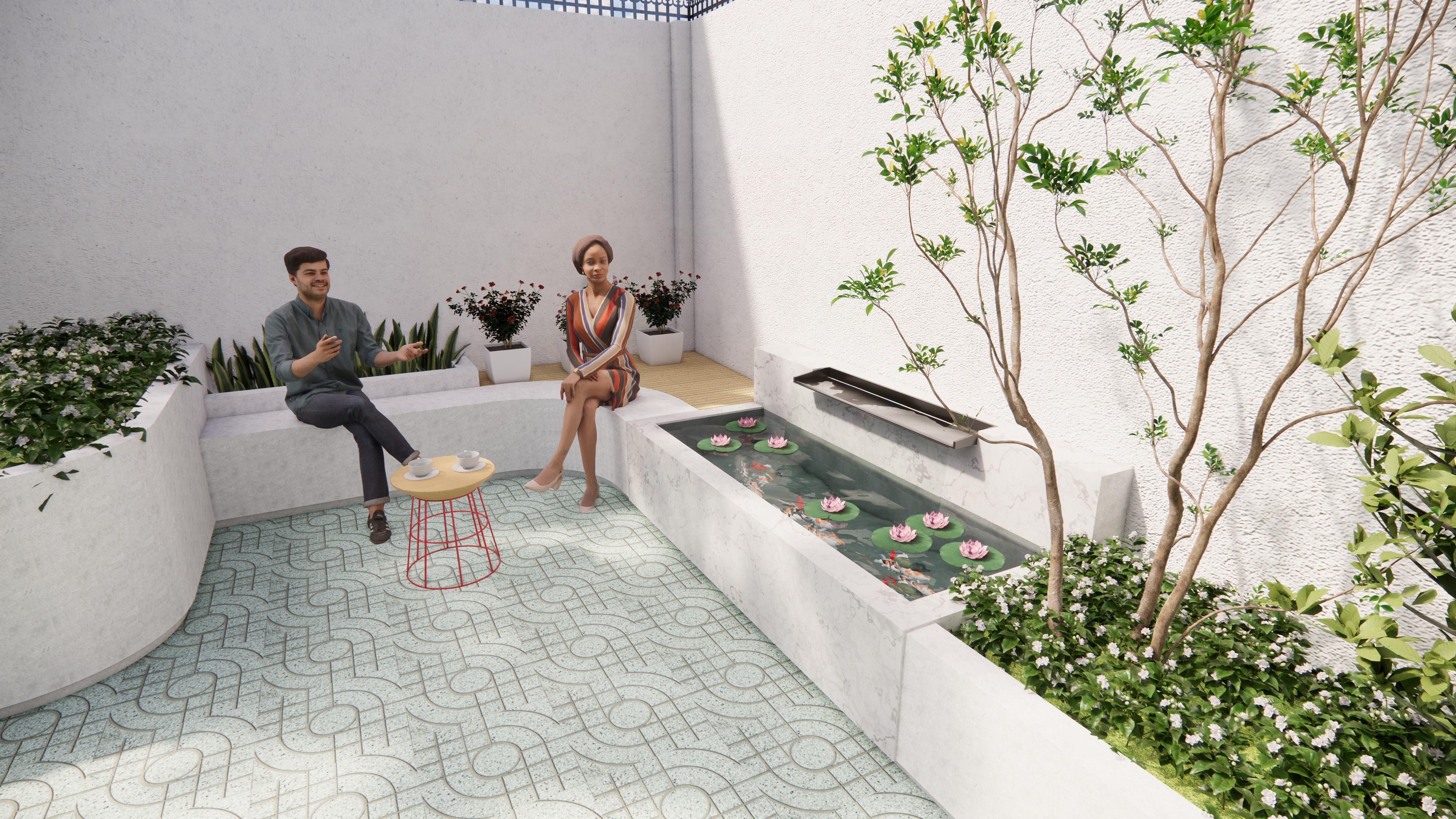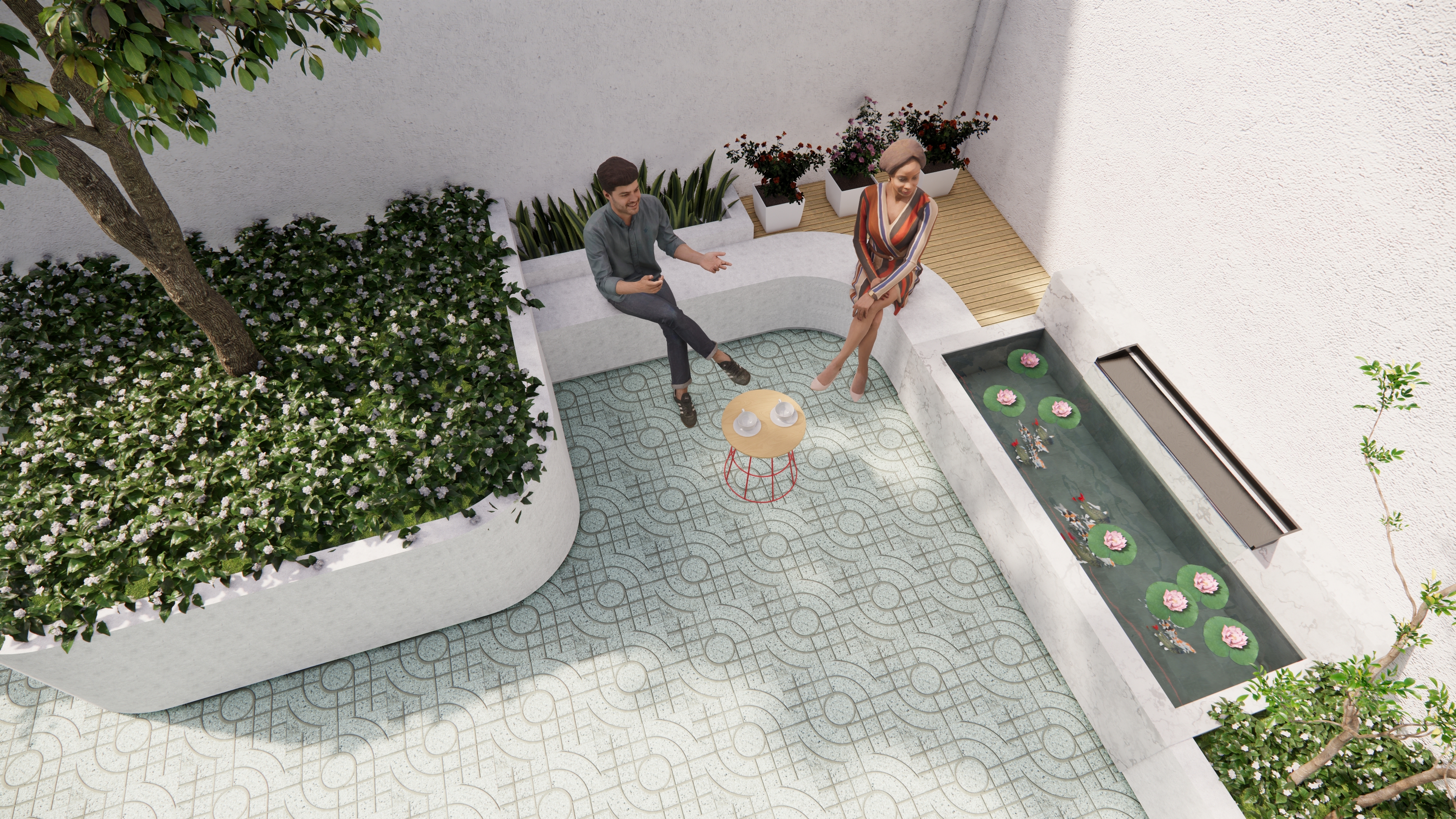 Điểm nhấn của không gian là góc ngồi thân mật kết hợp hồ nước nhỏ với sen và cá, tạo âm thanh và chuyển động dịu nhẹ – một “ốc đảo” tĩnh lặng giữa đô thị. Các chậu cây gốm và kệ trưng bày được bố trí linh hoạt dọc tường, vừa tăng chiều sâu không gian vừa thể hiện cá tính gia chủ. Tổng thể hướng đến sự cân bằng giữa công năng – thẩm mỹ – cảm xúc, mang lại trải nghiệm sống chậm, gần gũi thiên nhiên ngay trong nhịp sống năng động của TP. Hồ Chí Minh.