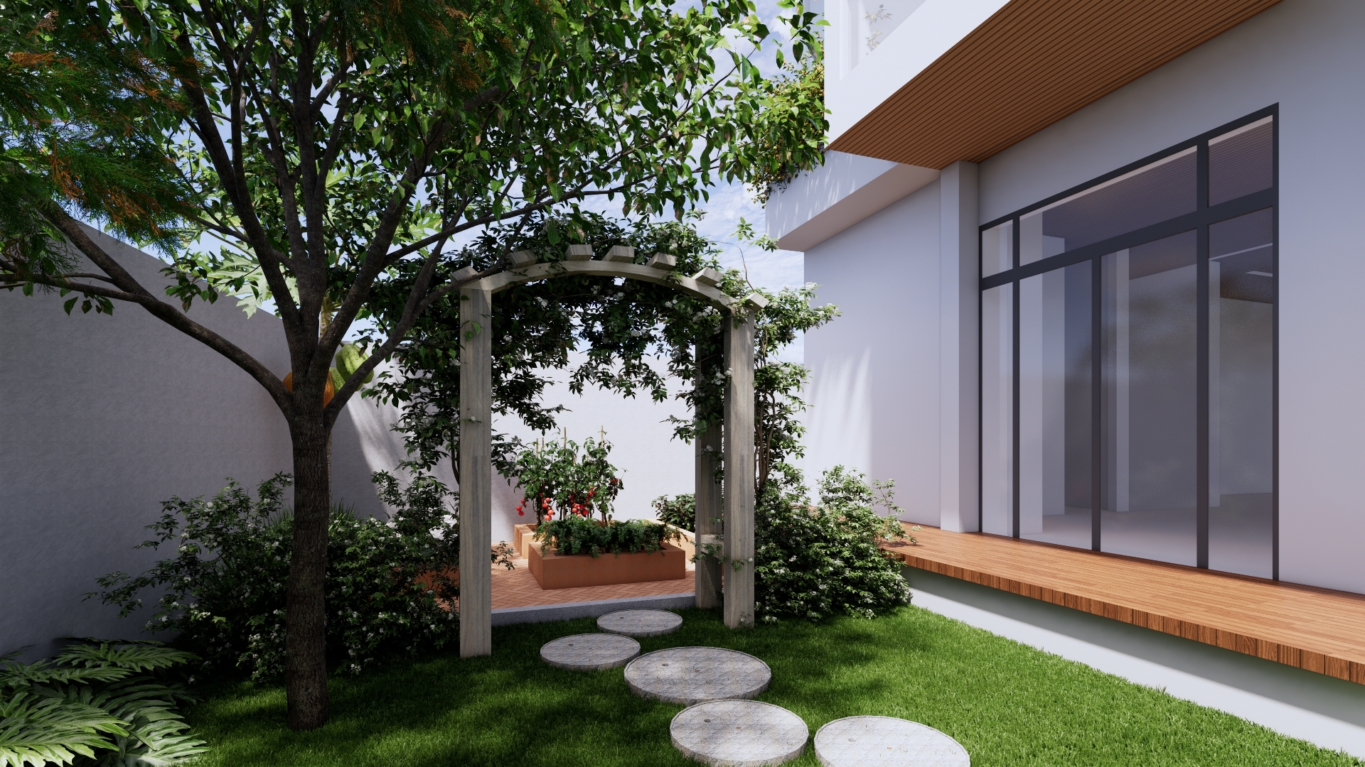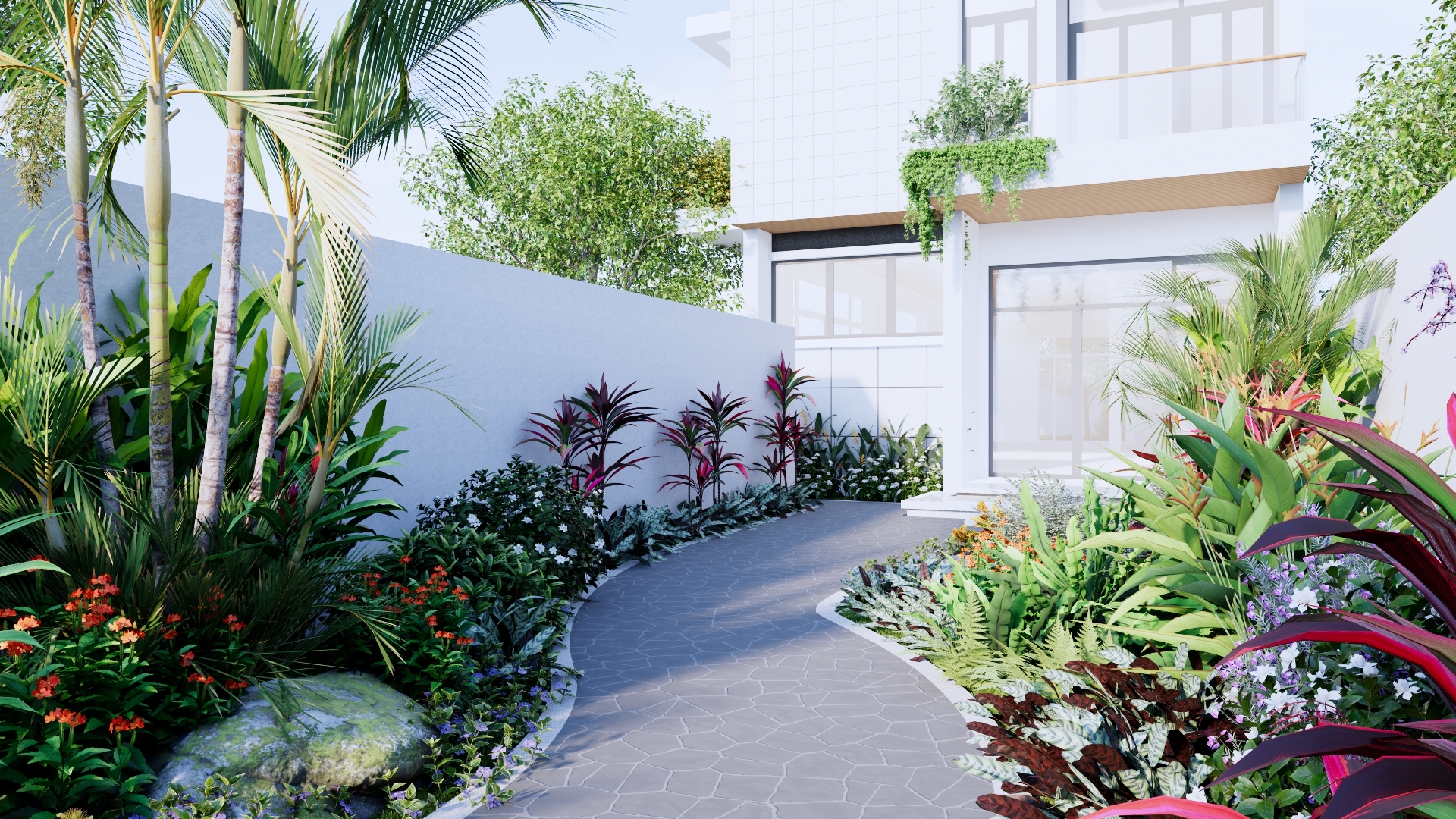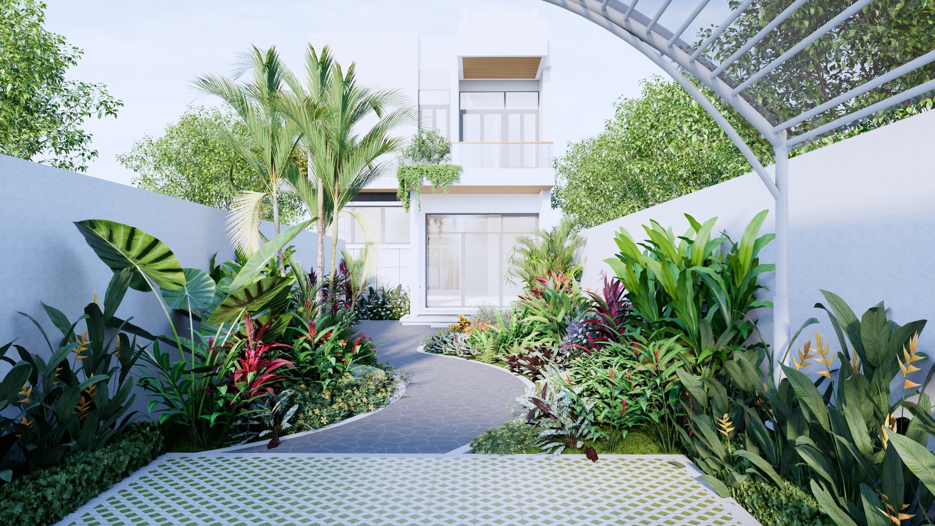 Sân vườn nhà chị Uyên tại TP. Hồ Chí Minh được định hình theo tinh thần “ốc đảo nhiệt đới” – nơi thiên nhiên len lỏi mềm mại trong không gian sống hiện đại. Đường dạo uốn lượn dẫn lối qua các lớp cây xanh đa tầng, kết hợp hài hòa giữa tán cao, tầng trung và thảm phủ, tạo cảm giác phong phú nhưng vẫn thông thoáng. Ngôn ngữ thiết kế chú trọng sự chuyển tiếp nhẹ nhàng: từ cổng vào với mảng xanh rực rỡ, đến khoảng sân thư giãn và góc vườn riêng tư dưới giàn pergola. Tổng thể mang đến một không gian sống thư thái, gần gũi thiên nhiên – nơi mỗi bước chân đều là một trải nghiệm nghỉ dưỡng ngay tại nhà.