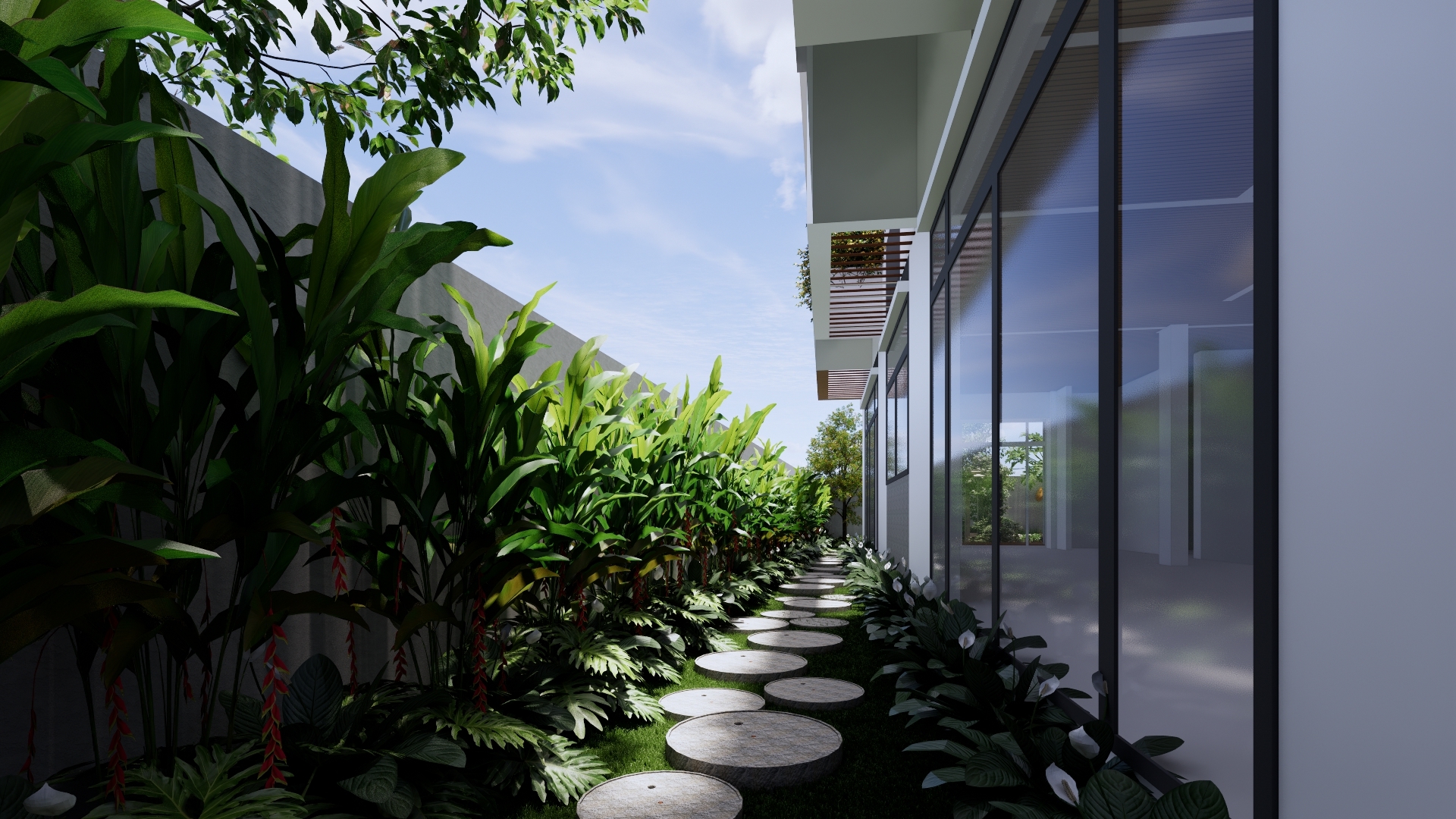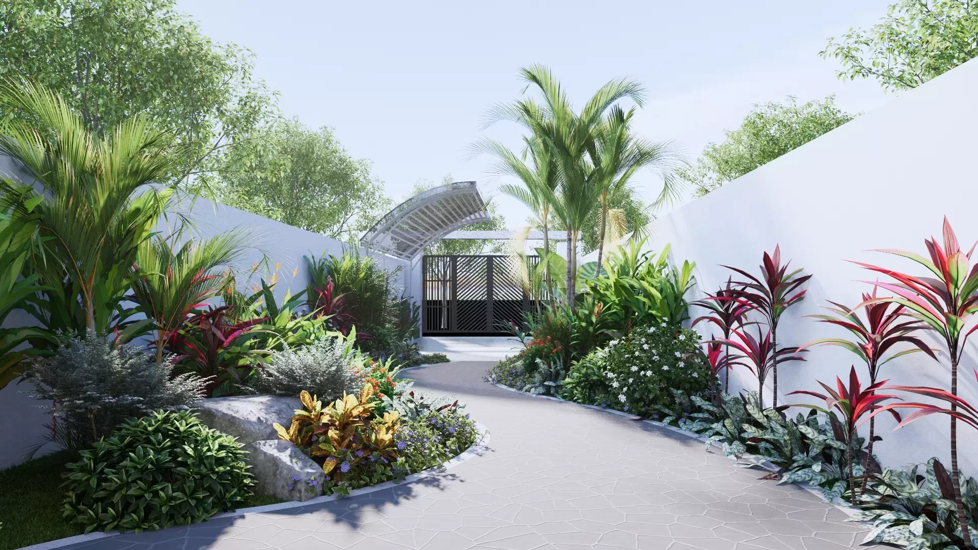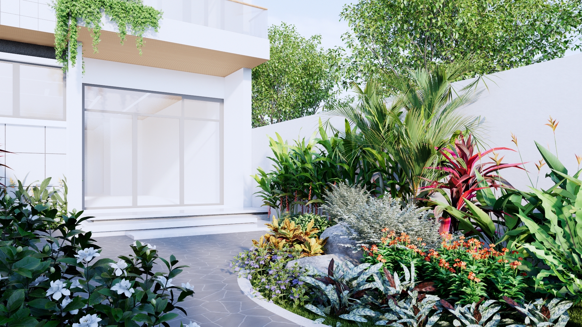 Sân vườn nhà chị Uyên tại TP. Hồ Chí Minh được định hình theo tinh thần “ốc đảo nhiệt đới” – nơi thiên nhiên len lỏi mềm mại trong không gian sống hiện đại. Đường dạo uốn lượn dẫn lối qua các lớp cây xanh đa tầng, kết hợp hài hòa giữa tán cao, tầng trung và thảm phủ, tạo cảm giác phong phú nhưng vẫn thông thoáng. Ngôn ngữ thiết kế chú trọng sự chuyển tiếp nhẹ nhàng: từ cổng vào với mảng xanh rực rỡ, đến khoảng sân thư giãn và góc vườn riêng tư dưới giàn pergola. Tổng thể mang đến một không gian sống thư thái, gần gũi thiên nhiên – nơi mỗi bước chân đều là một trải nghiệm nghỉ dưỡng ngay tại nhà.