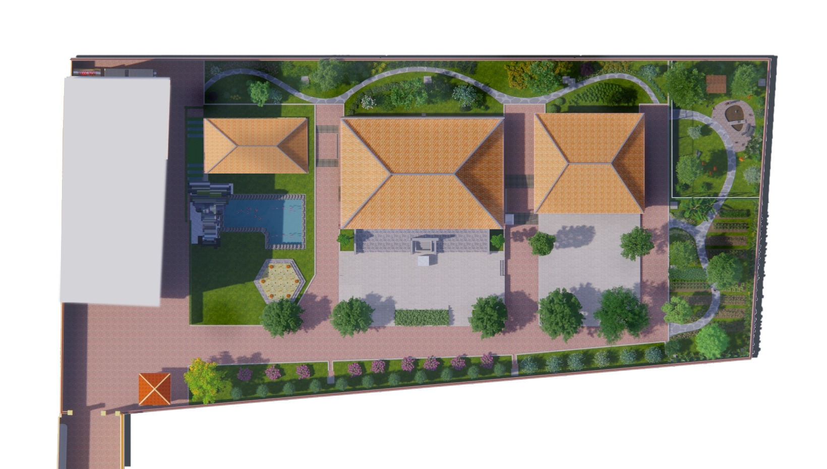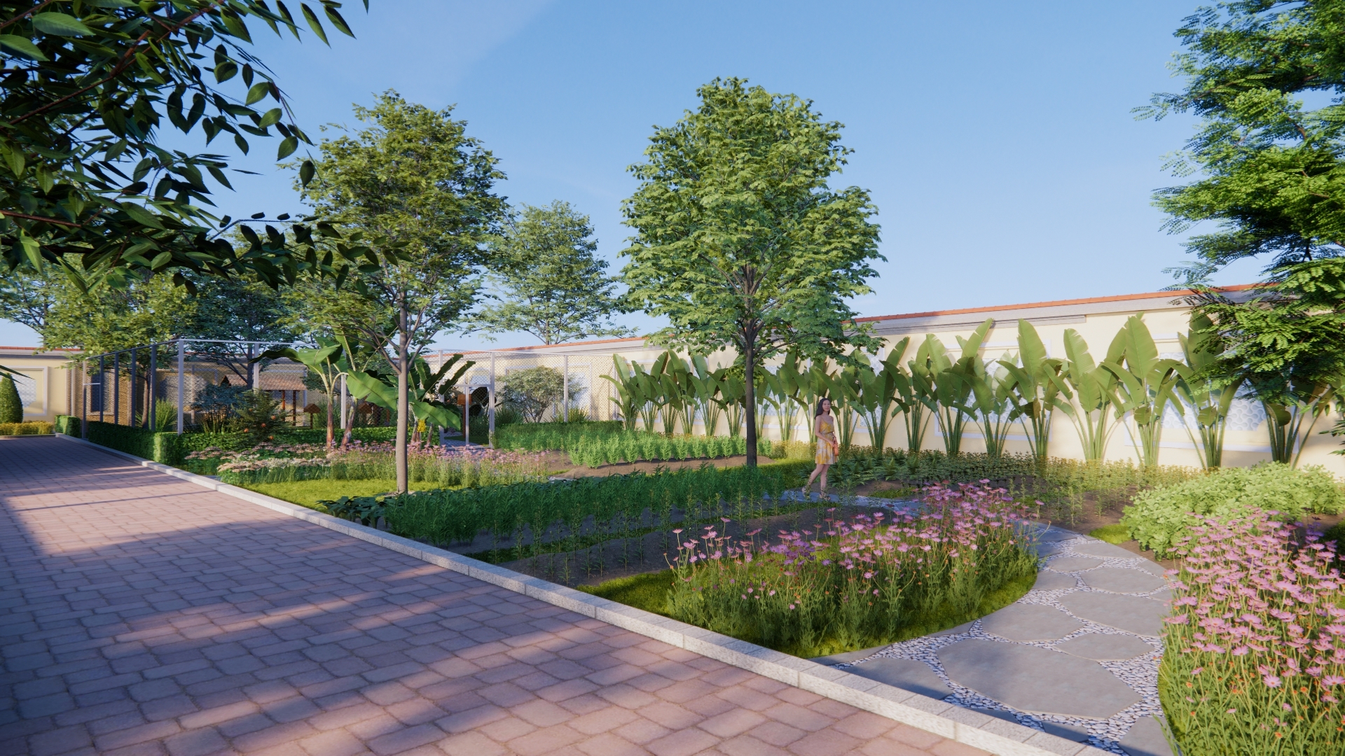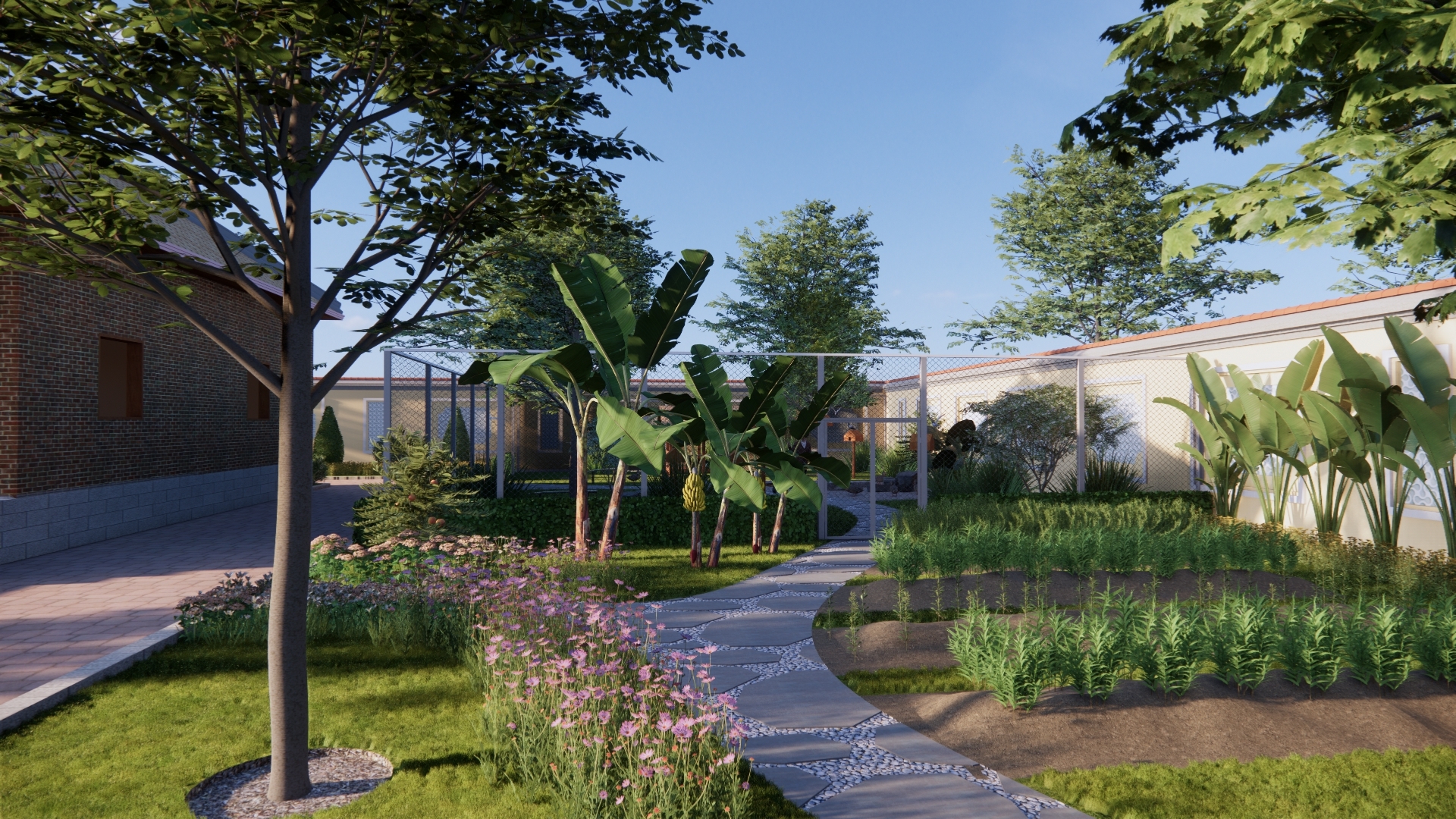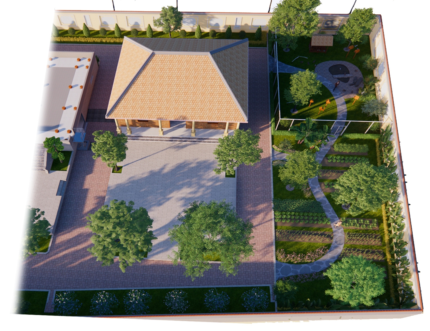 Thiết kế cảnh quan được định hình theo tinh thần “nhà vườn nghỉ dưỡng” – nơi cân bằng giữa kiến trúc và thiên nhiên, phù hợp với nhịp sống đô thị tại Bình Tân, TP. Hồ Chí Minh. Không gian được tổ chức theo trục sân trung tâm kết nối các khối nhà, mở rộng tầm nhìn và đón gió tự nhiên. Điểm nhấn là hồ nước kết hợp thác đá và tiểu cảnh non bộ, tạo vi khí hậu mát mẻ, đồng thời mang yếu tố phong thủy hài hòa. Hệ thống đường dạo uốn lượn dẫn dắt trải nghiệm qua các lớp cảnh quan: vườn hoa, vườn cây ăn trái, khu thư giãn với chòi nghỉ và khoảng sân mở. Cây xanh được lựa chọn đa tầng, xen kẽ giữa cây bóng mát, cây bụi và thảm cỏ nhằm tạo chiều sâu và sự riêng tư. Tổng thể hướng đến một không gian sống chậm, gần gũi thiên nhiên – nơi gia chủ có thể nghỉ ngơi, tái tạo năng lượng ngay trong chính khu vườn của mình.