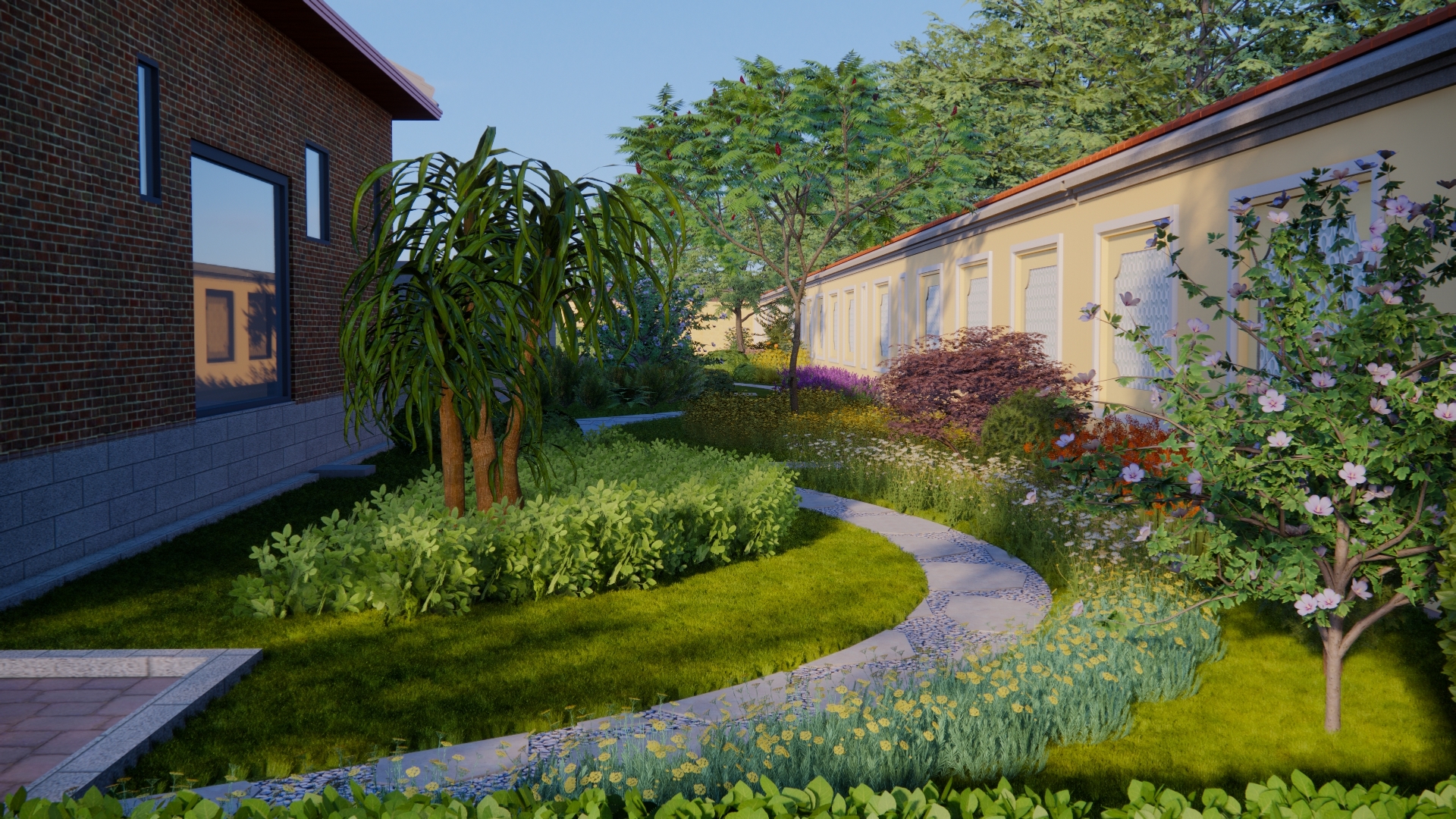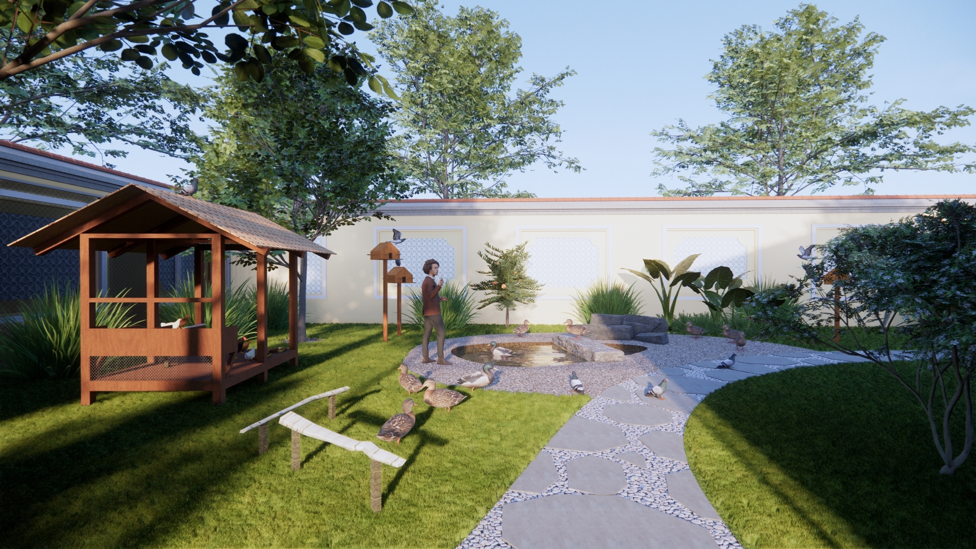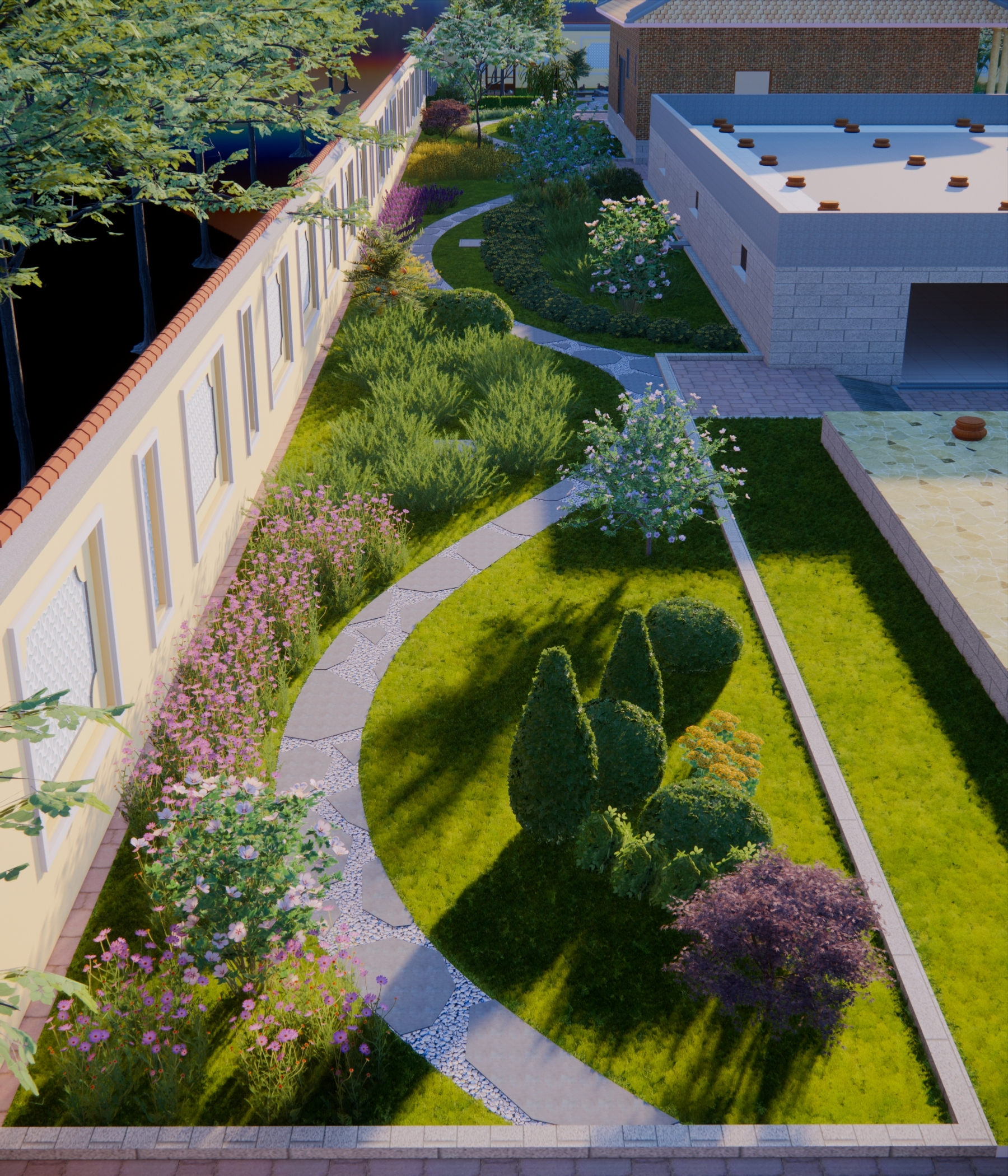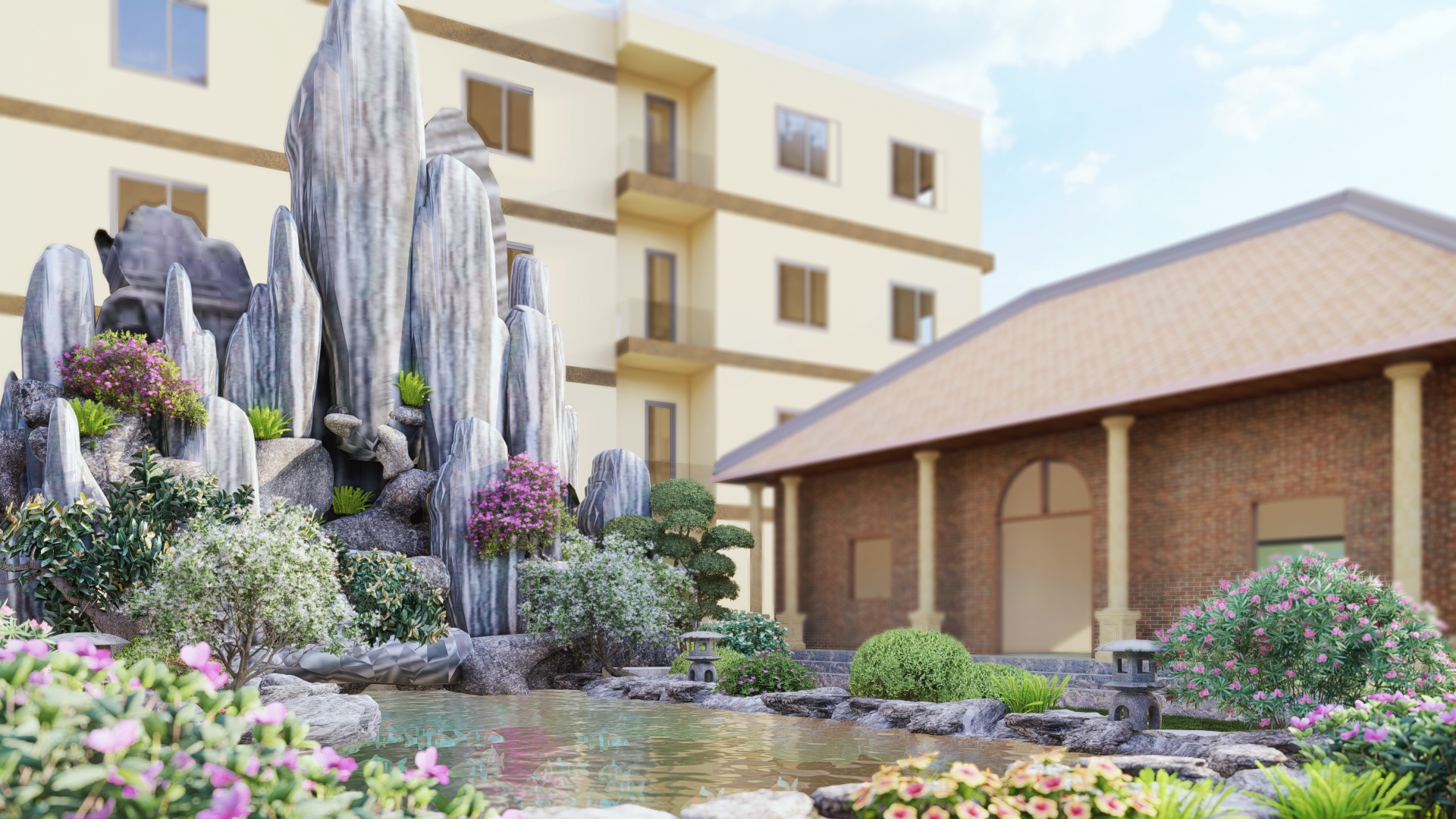 Thiết kế cảnh quan được định hình theo tinh thần “nhà vườn nghỉ dưỡng” – nơi cân bằng giữa kiến trúc và thiên nhiên, phù hợp với nhịp sống đô thị tại Bình Tân, TP. Hồ Chí Minh. Không gian được tổ chức theo trục sân trung tâm kết nối các khối nhà, mở rộng tầm nhìn và đón gió tự nhiên. Điểm nhấn là hồ nước kết hợp thác đá và tiểu cảnh non bộ, tạo vi khí hậu mát mẻ, đồng thời mang yếu tố phong thủy hài hòa. Hệ thống đường dạo uốn lượn dẫn dắt trải nghiệm qua các lớp cảnh quan: vườn hoa, vườn cây ăn trái, khu thư giãn với chòi nghỉ và khoảng sân mở. Cây xanh được lựa chọn đa tầng, xen kẽ giữa cây bóng mát, cây bụi và thảm cỏ nhằm tạo chiều sâu và sự riêng tư. Tổng thể hướng đến một không gian sống chậm, gần gũi thiên nhiên – nơi gia chủ có thể nghỉ ngơi, tái tạo năng lượng ngay trong chính khu vườn của mình.