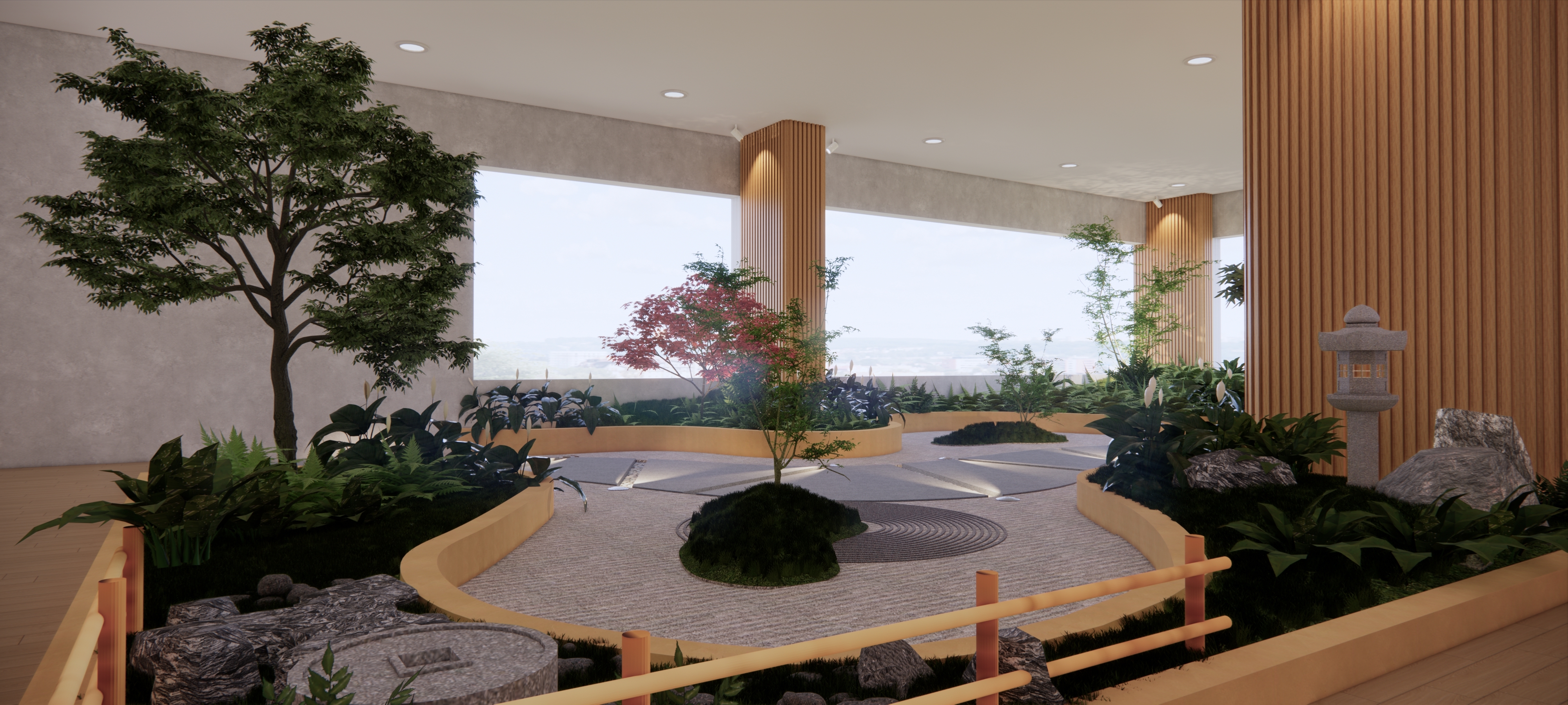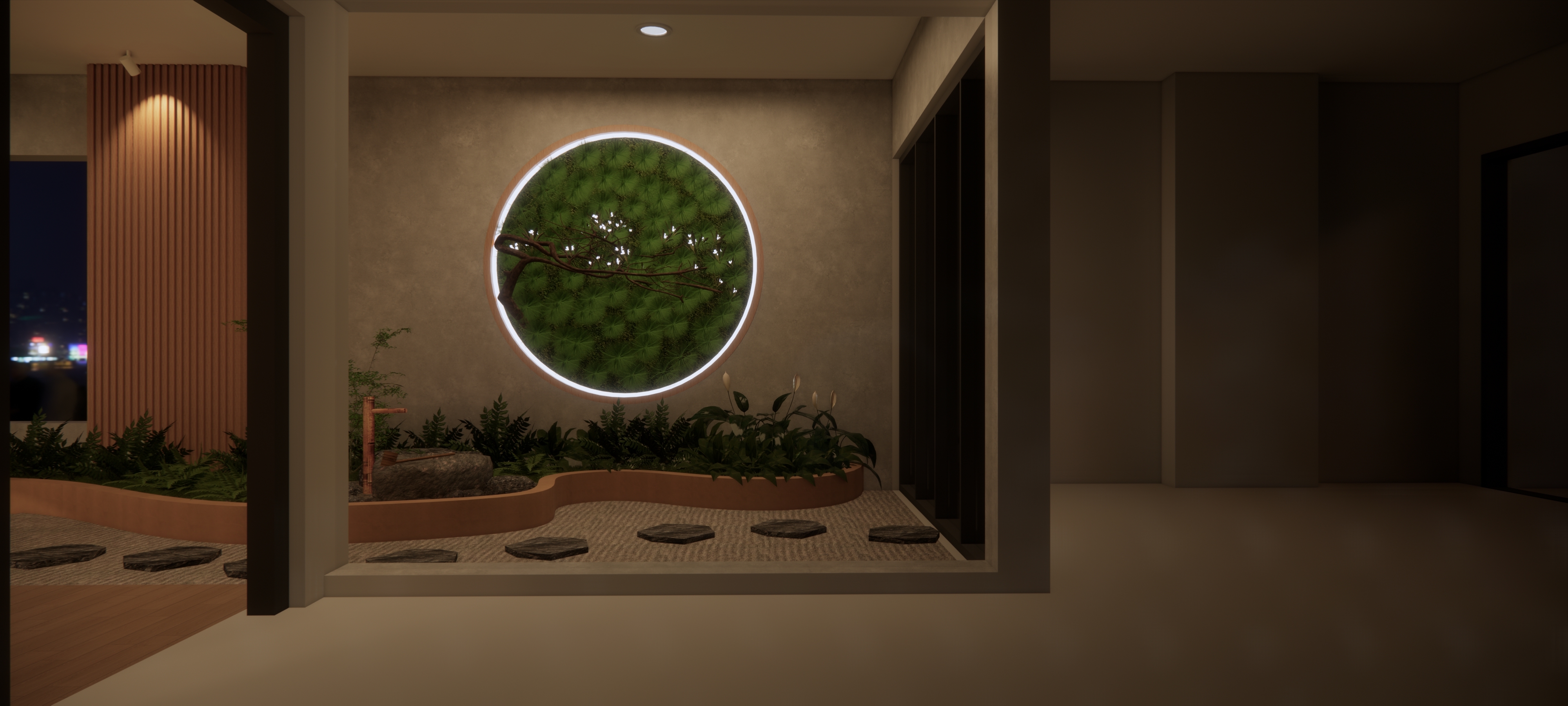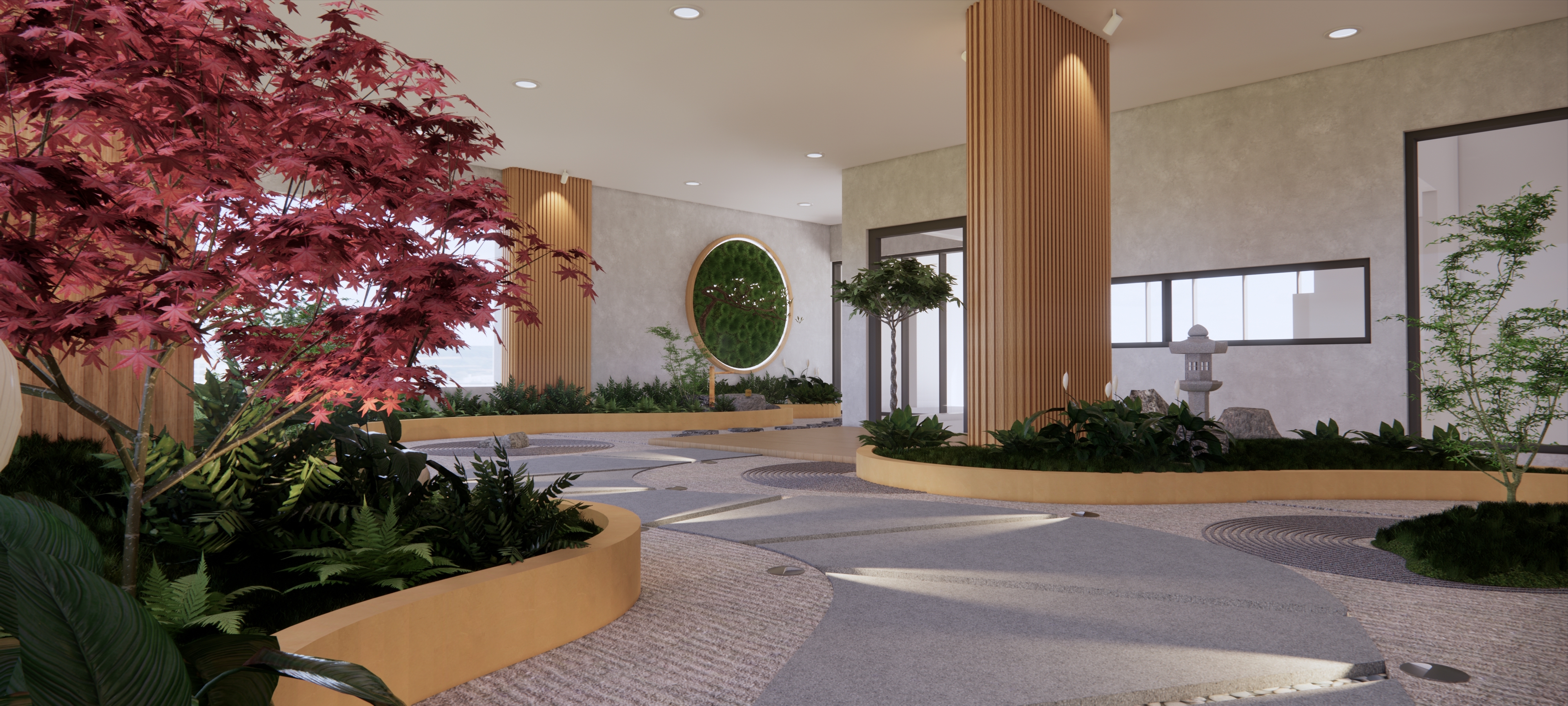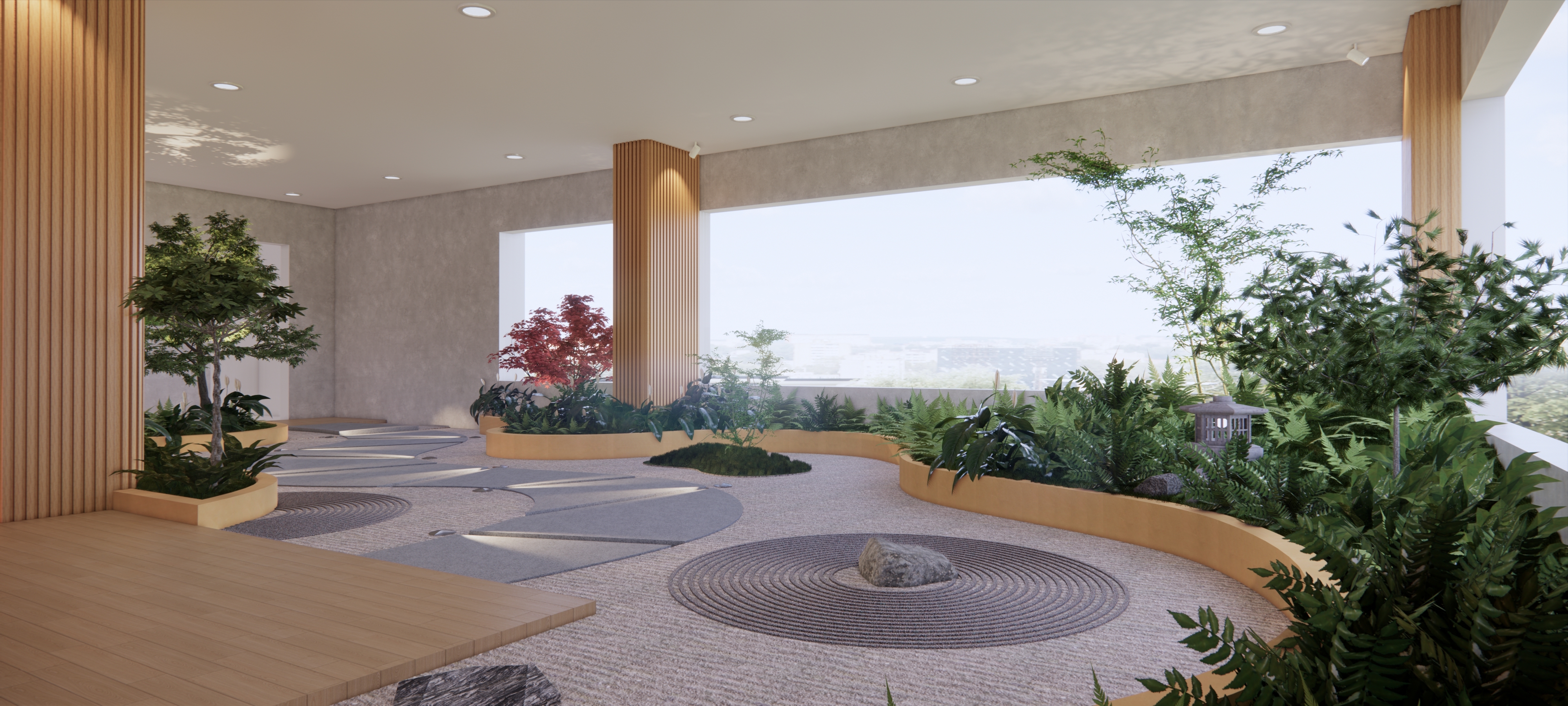 Không gian cảnh quan được hình thành như một “khu vườn thiền thu nhỏ” giữa lòng căn hộ, mang tinh thần Nhật Bản nhưng được điều chỉnh phù hợp với bối cảnh đô thị TP. Hồ Chí Minh. Ý tưởng chủ đạo là tạo nên một khoảng lặng – nơi con người có thể tạm tách khỏi nhịp sống sôi động bên ngoài để tìm lại sự cân bằng.