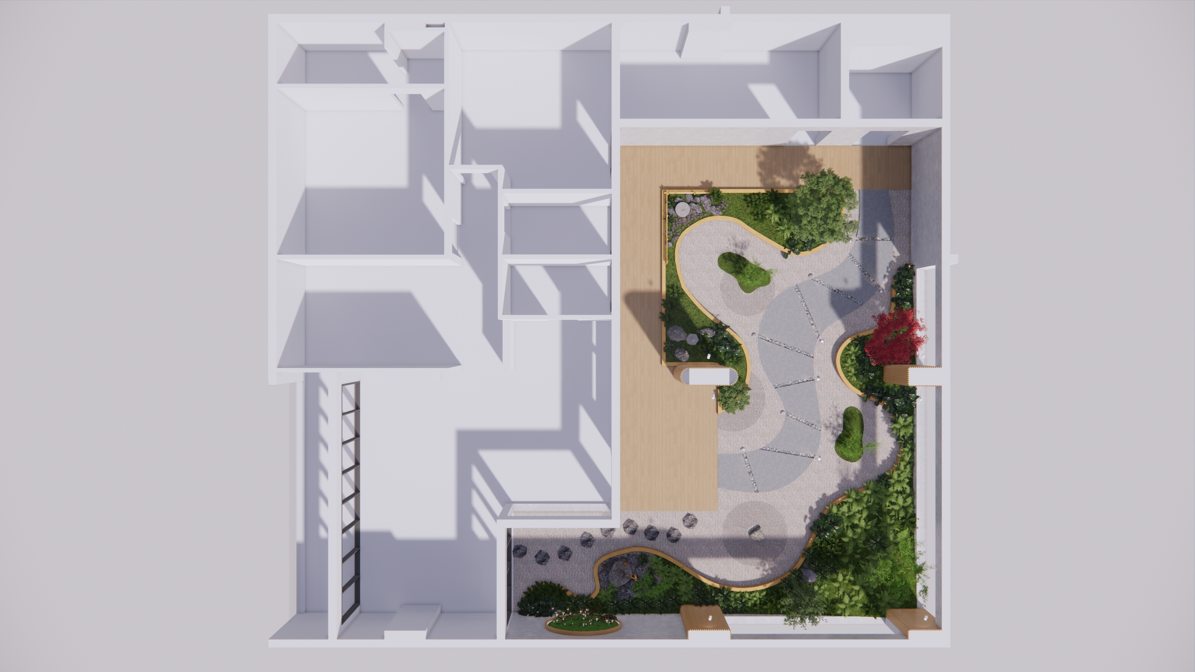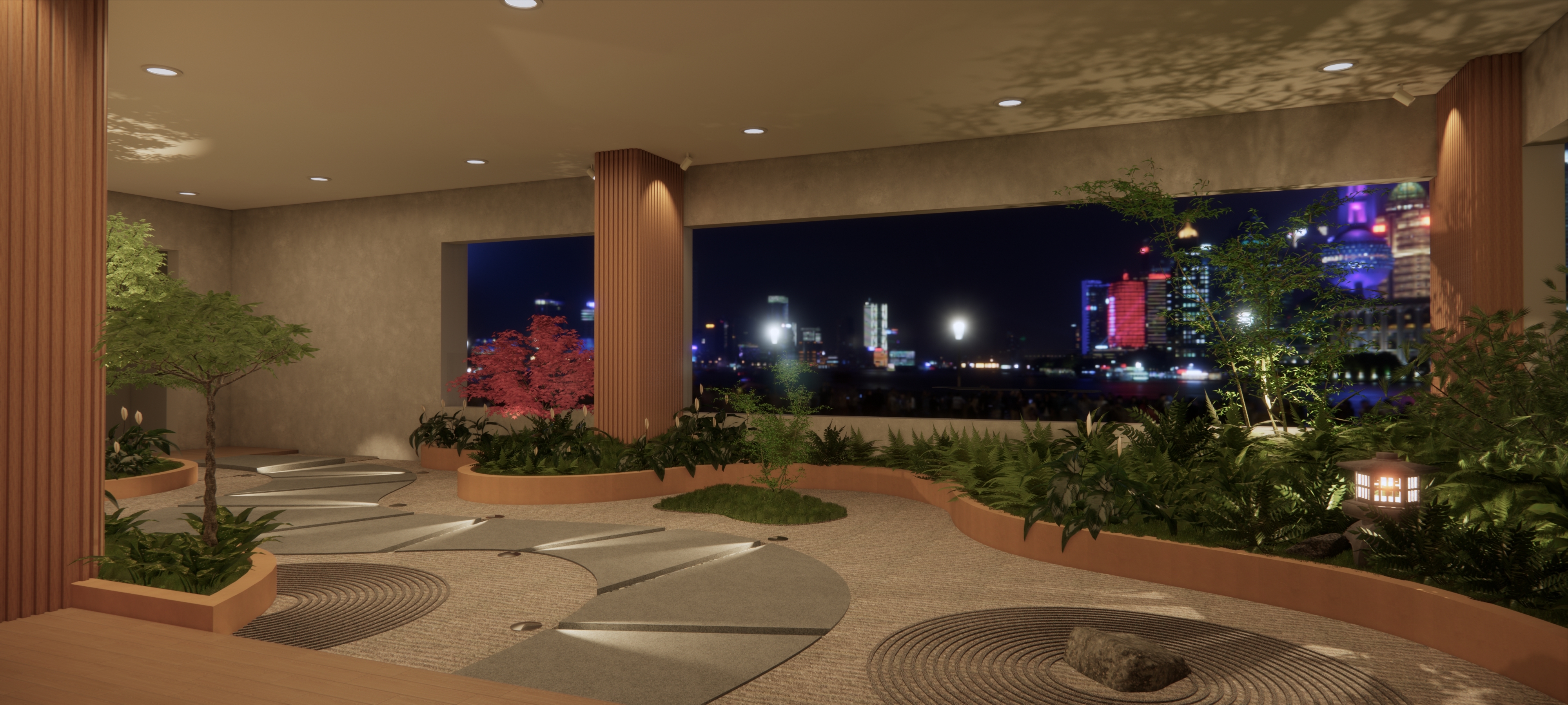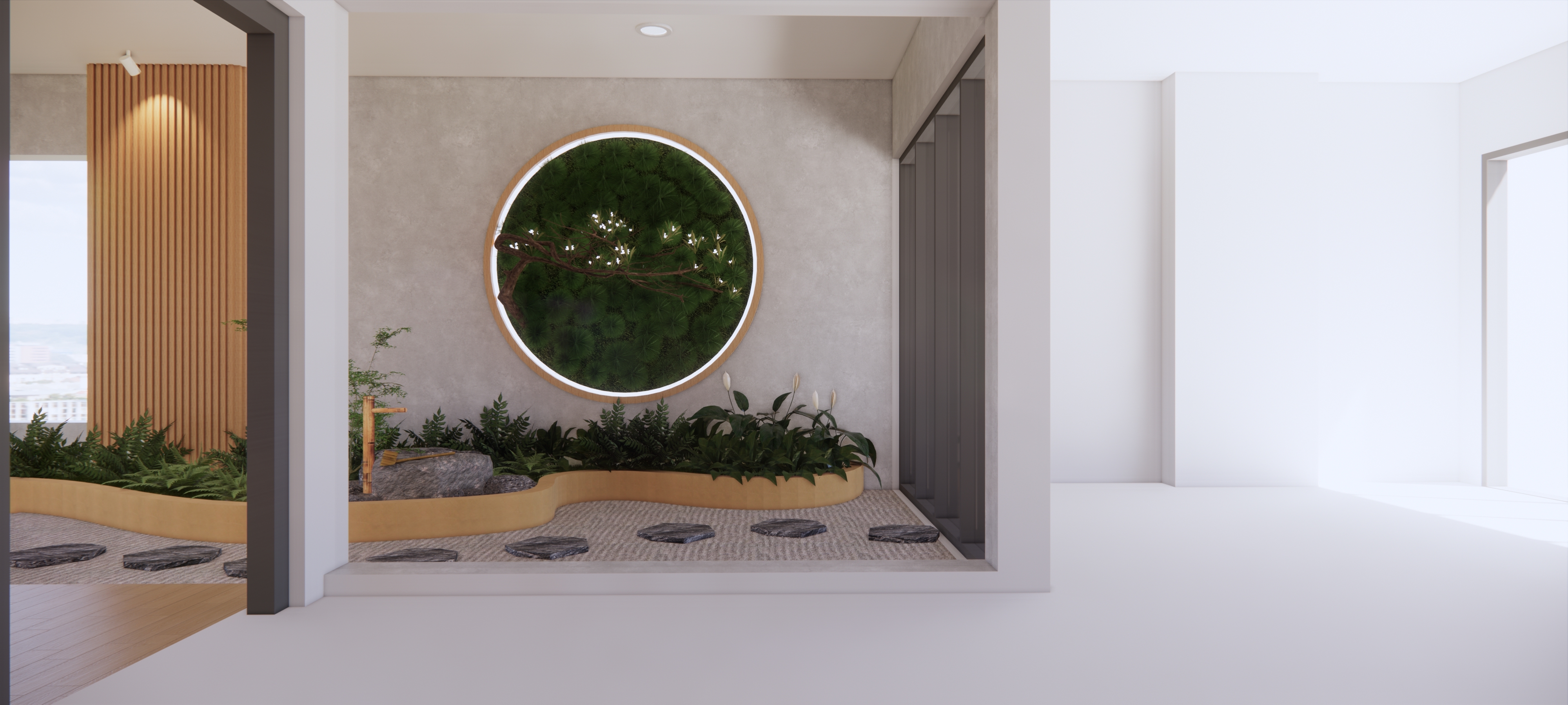 Không gian cảnh quan được hình thành như một “khu vườn thiền thu nhỏ” giữa lòng căn hộ, mang tinh thần Nhật Bản nhưng được điều chỉnh phù hợp với bối cảnh đô thị TP. Hồ Chí Minh. Ý tưởng chủ đạo là tạo nên một khoảng lặng – nơi con người có thể tạm tách khỏi nhịp sống sôi động bên ngoài để tìm lại sự cân bằng.