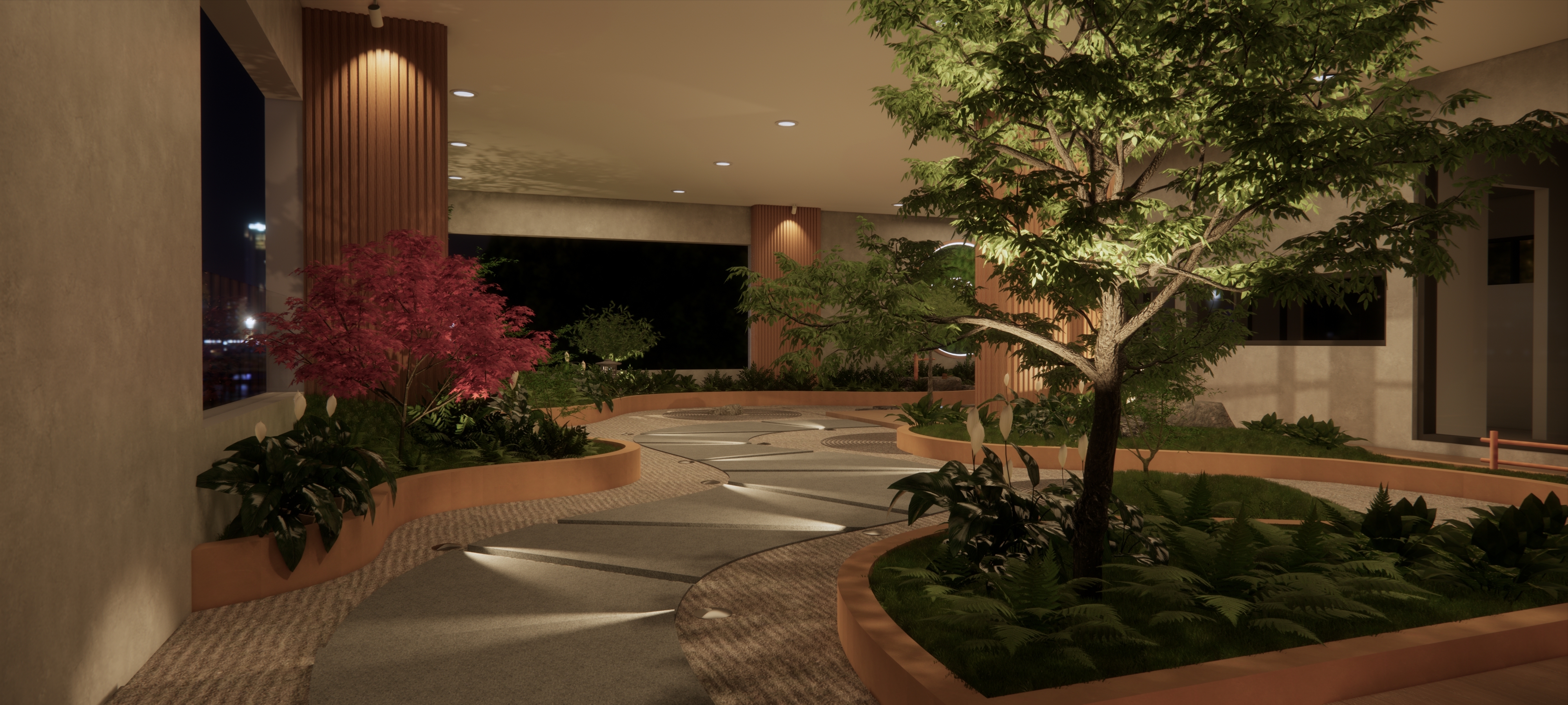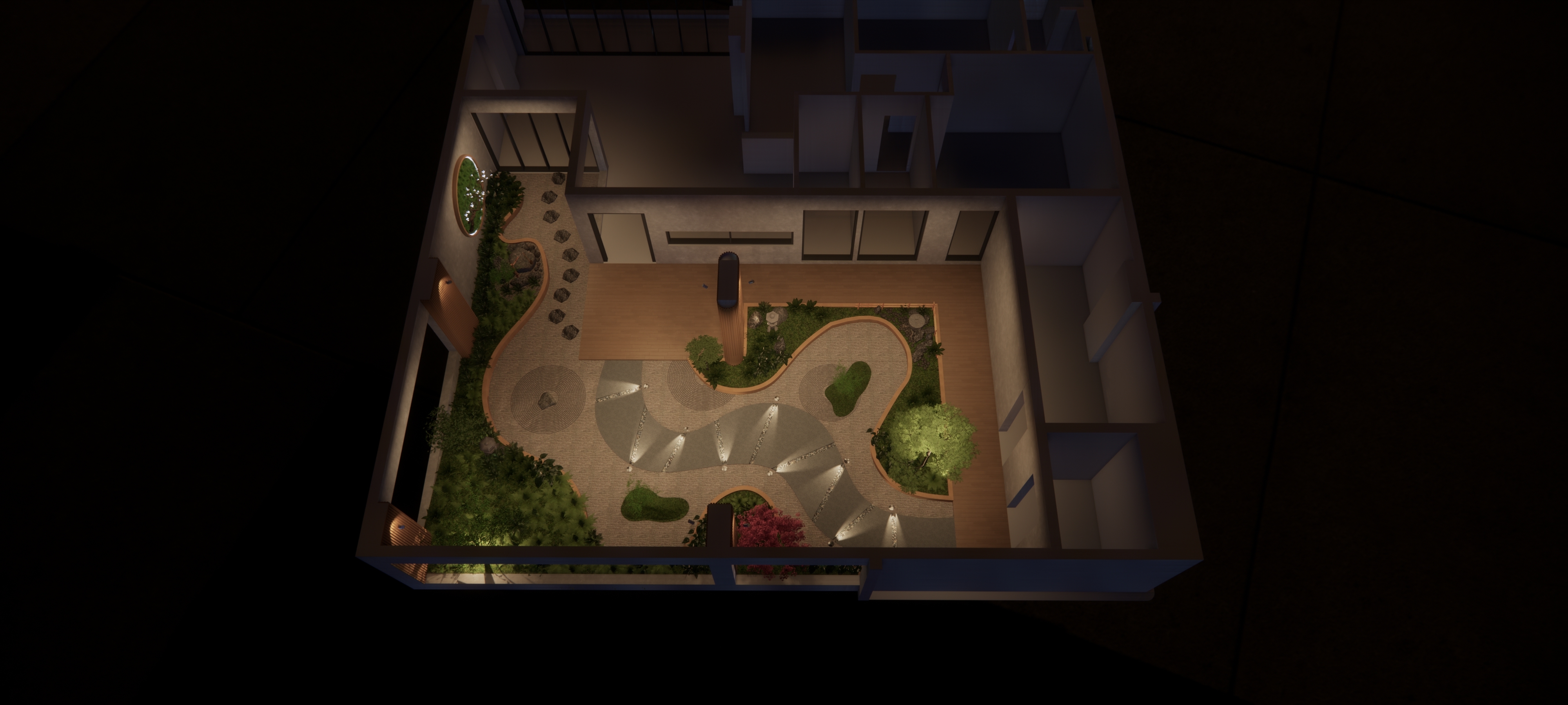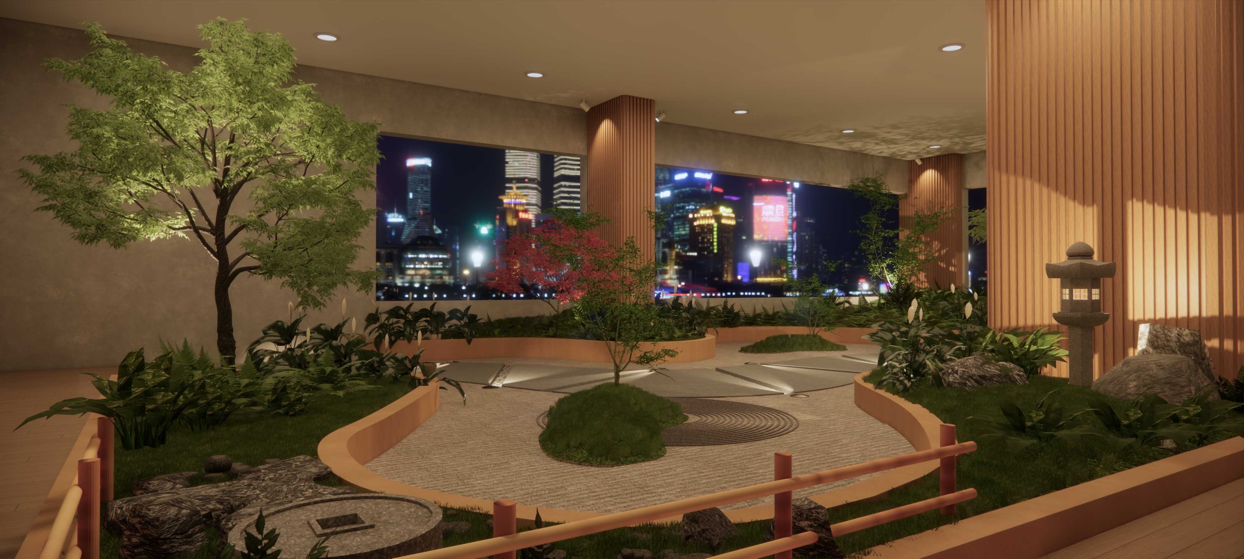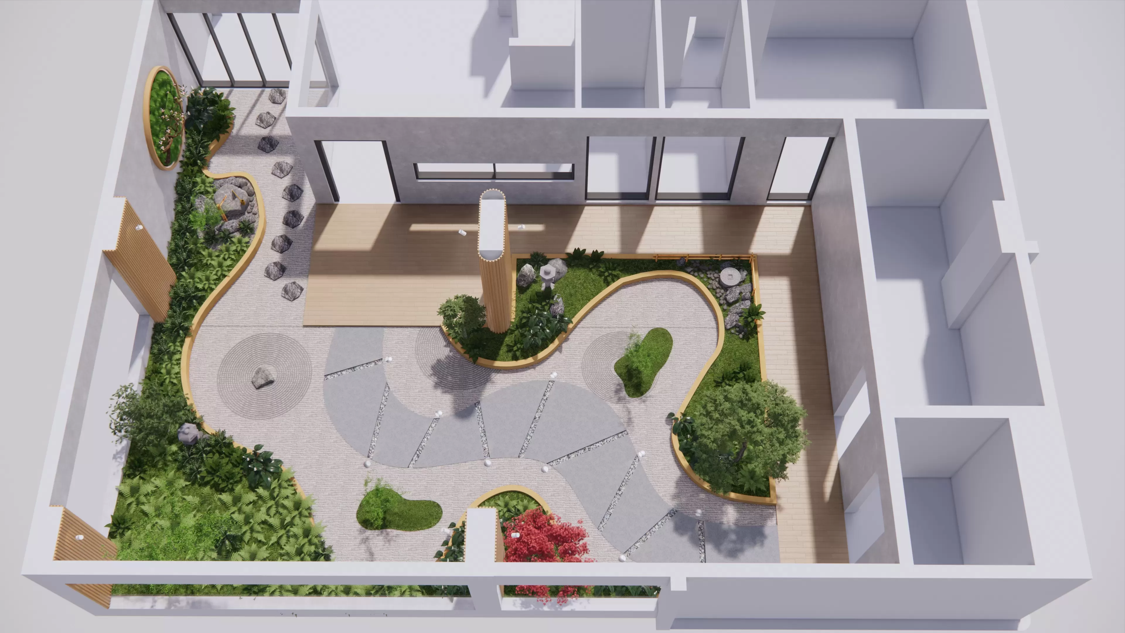 Không gian cảnh quan được hình thành như một “khu vườn thiền thu nhỏ” giữa lòng căn hộ, mang tinh thần Nhật Bản nhưng được điều chỉnh phù hợp với bối cảnh đô thị TP. Hồ Chí Minh. Ý tưởng chủ đạo là tạo nên một khoảng lặng – nơi con người có thể tạm tách khỏi nhịp sống sôi động bên ngoài để tìm lại sự cân bằng.