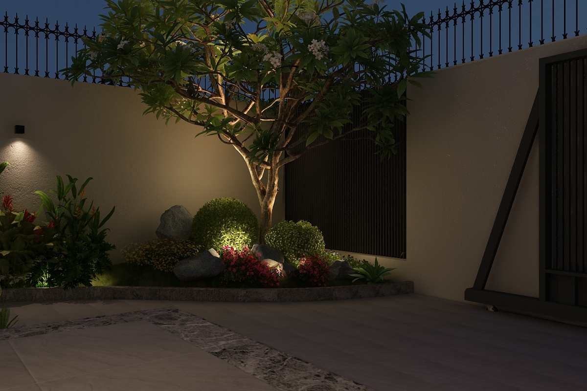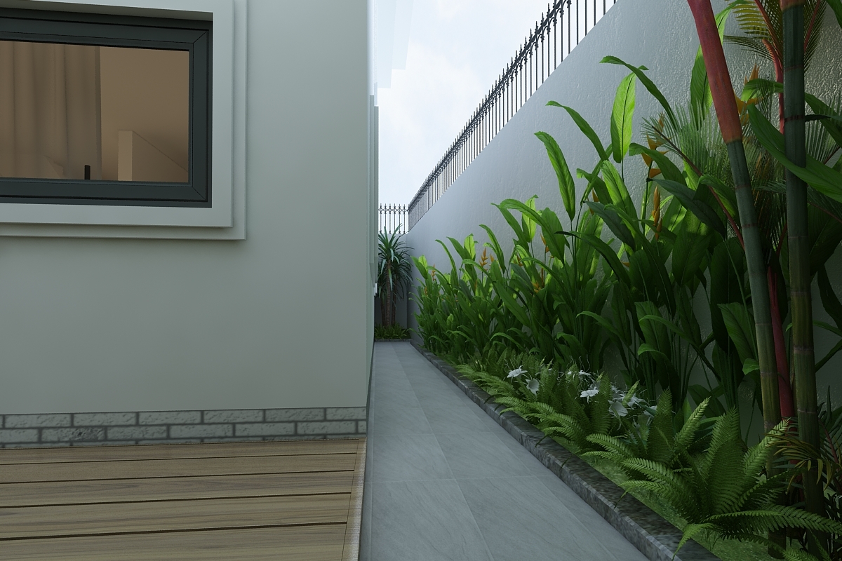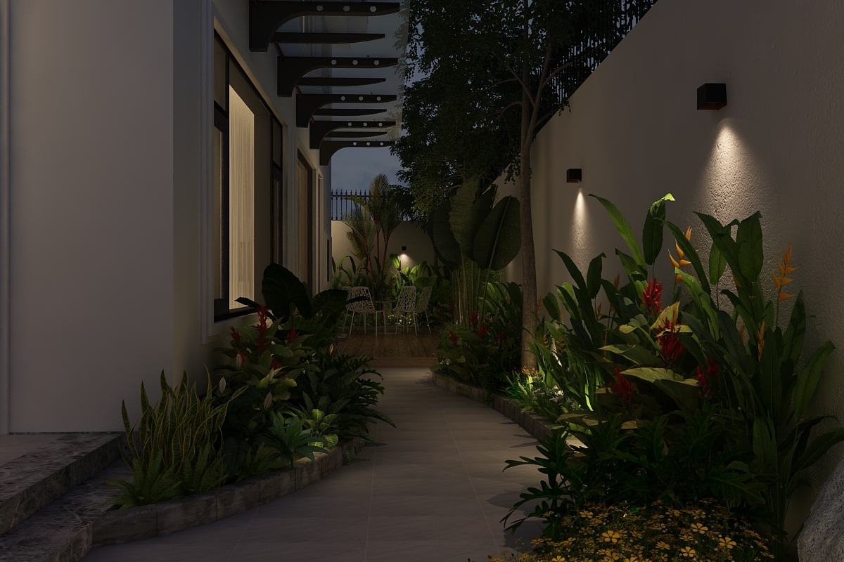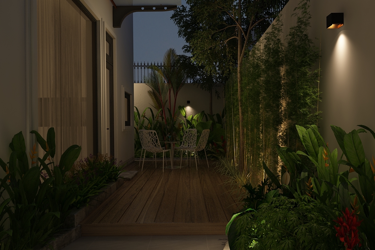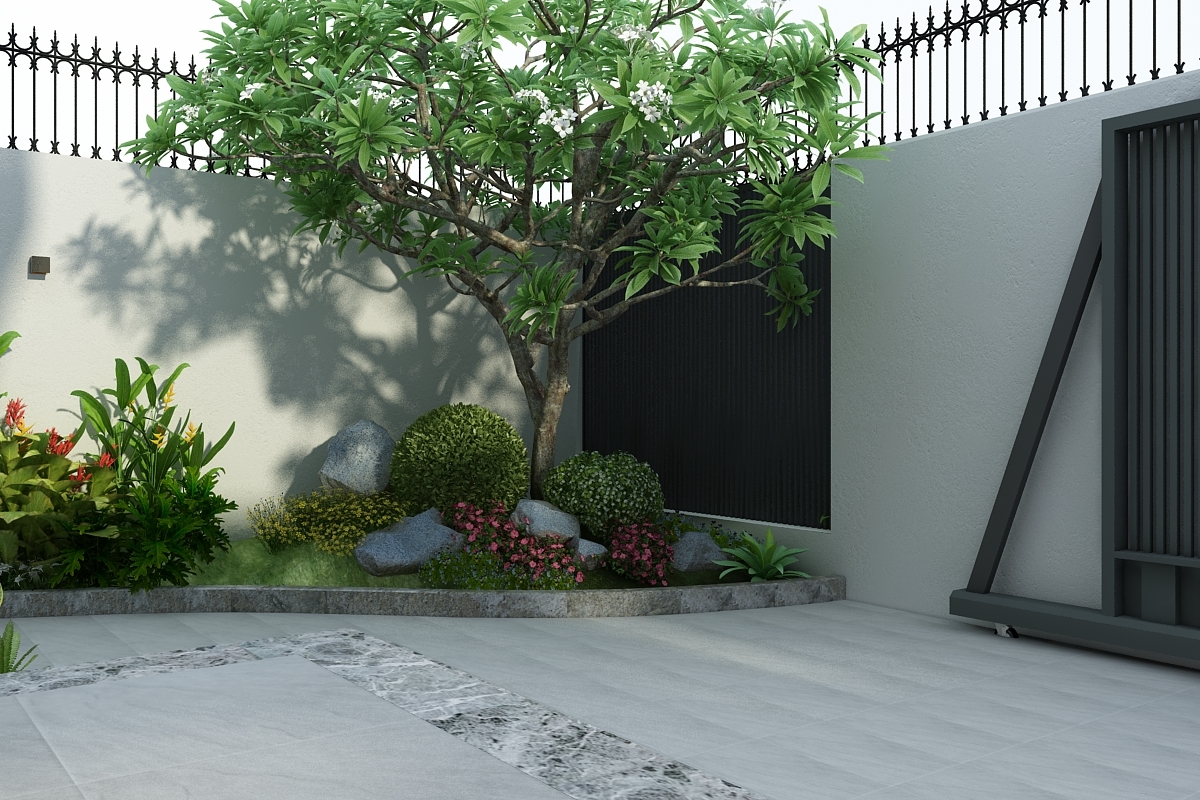Lấy cảm hứng từ khí hậu nhiệt đới ven biển Vũng Tàu, thiết kế hướng đến một không gian sân vườn nhà phố xanh mát, riêng tư và giàu trải nghiệm. Ngôn ngữ hình khối hiện đại của công trình được làm mềm bằng các lớp cây đa tầng, kết hợp hài hòa giữa mảng xanh nhiệt đới, hoa leo điểm nhấn và các cụm tiểu cảnh đá tự nhiên. Lối dạo uốn lượn nhẹ dẫn dắt tầm nhìn, mở ra những góc nghỉ thư giãn ẩn mình dưới tán cây, tạo cảm giác gần gũi thiên nhiên ngay trong lòng đô thị. Sự đan xen giữa vật liệu cứng – mềm, ánh sáng – bóng râm không chỉ tăng tính thẩm mỹ mà còn tối ưu vi khí hậu, mang lại không gian sống trong lành, thư thái và bền vững cho gia chủ.