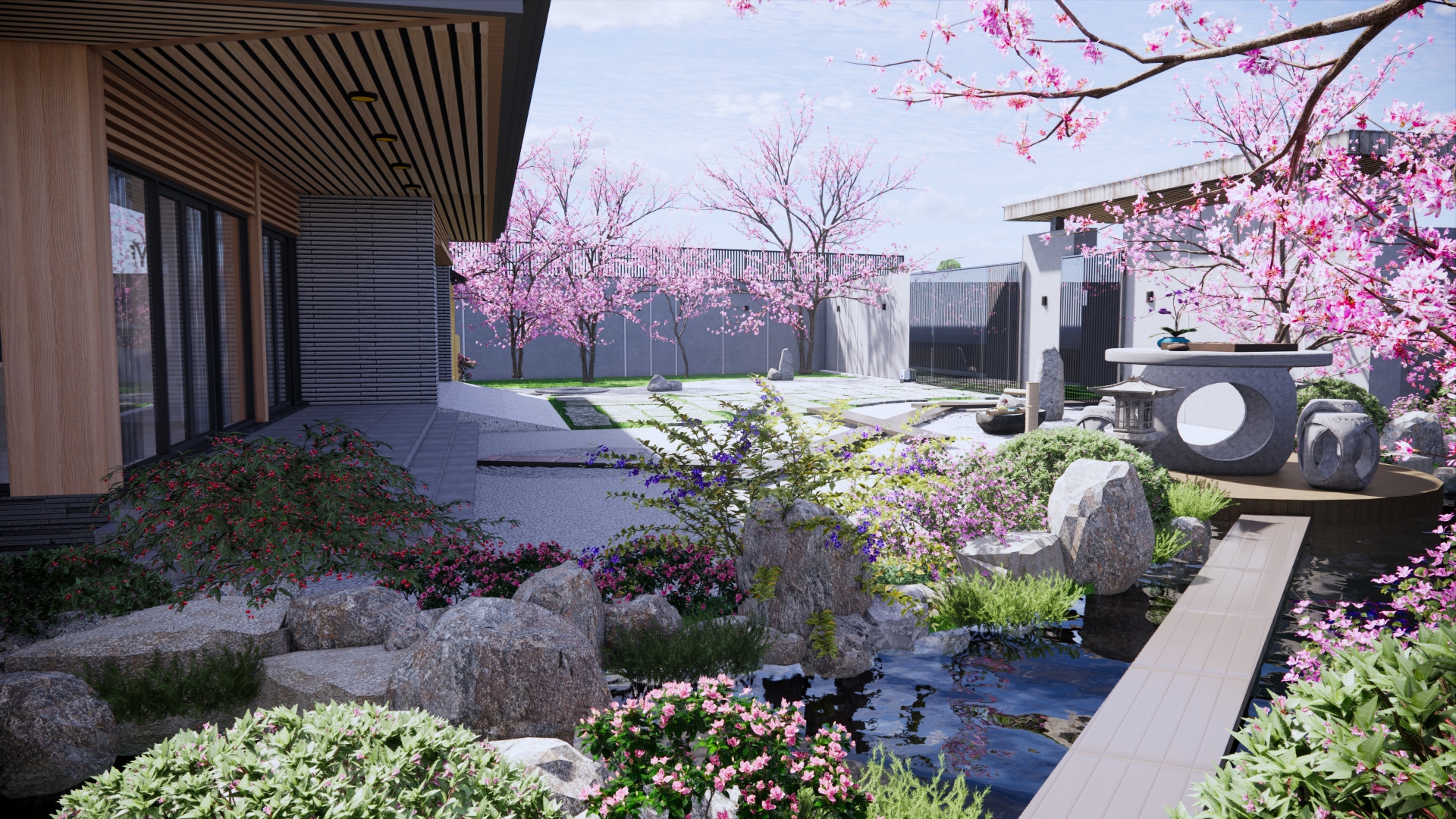 Phương án thiết kế cảnh quan lấy cảm hứng từ tinh thần vườn Nhật – đề cao sự tĩnh tại, cân bằng và kết nối con người với tự nhiên – được tổ chức hài hòa trong điều kiện khí hậu Đồng Nai. Tổng thể không gian được cấu trúc theo nguyên lý “mượn cảnh – dẫn lối – tạo điểm dừng”, với trục giao thông uốn lượn mềm mại, kết hợp cầu gỗ, lối dạo và các khoảng chuyển tiếp mở – kín nhằm tạo trải nghiệm liên tục, giàu chiều sâu. Yếu tố nước đóng vai trò trung tâm, với suối cảnh quan ôm quanh công trình, kết hợp thác nhẹ và hồ tĩnh, giúp điều hòa vi khí hậu và tạo âm thanh thư giãn đặc trưng. Tổng thể hướng đến một khu vườn sống – nơi kiến trúc và cảnh quan hòa quyện, mang lại trải nghiệm an yên, tinh tế và bền vững cho gia chủ.