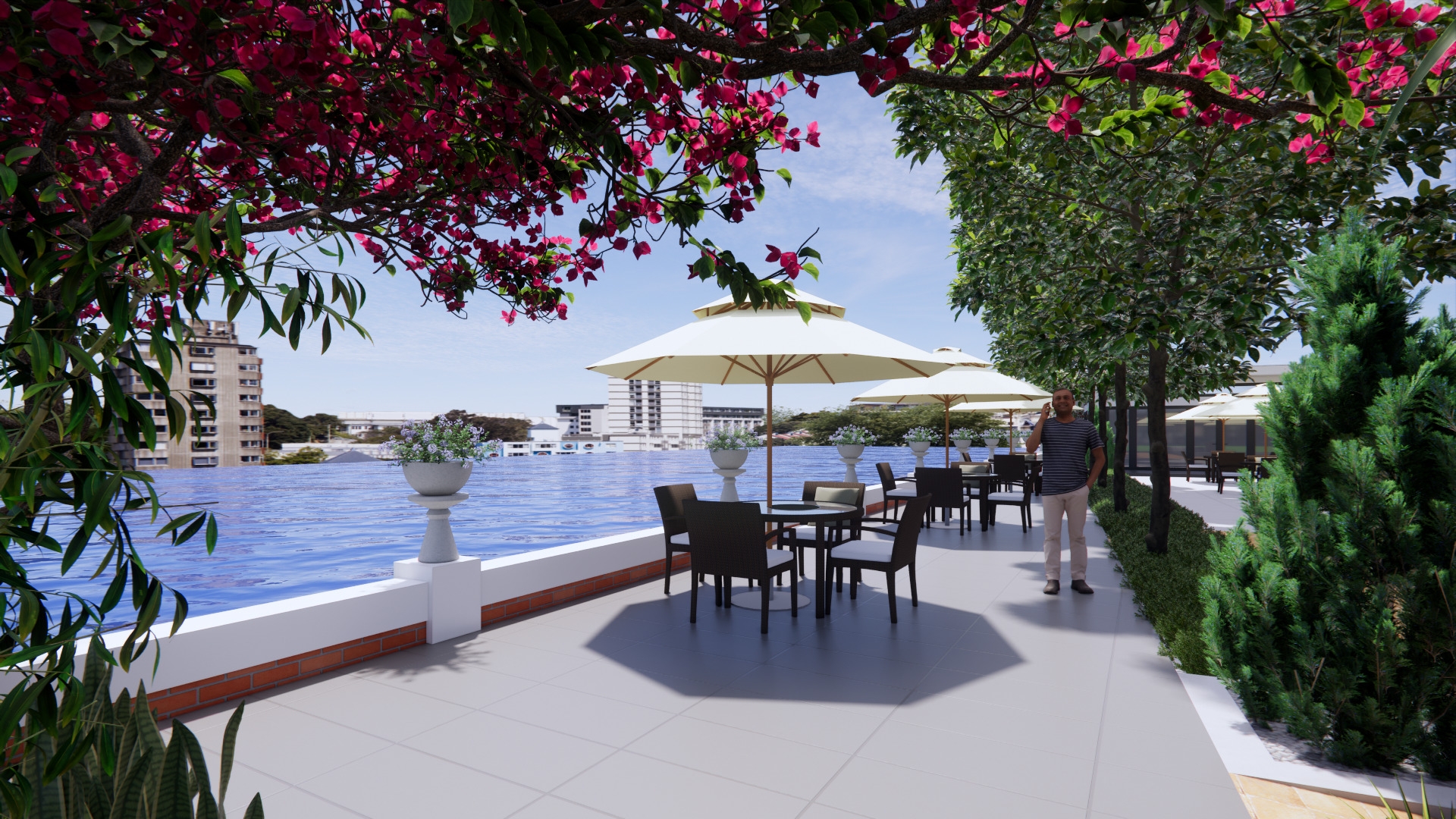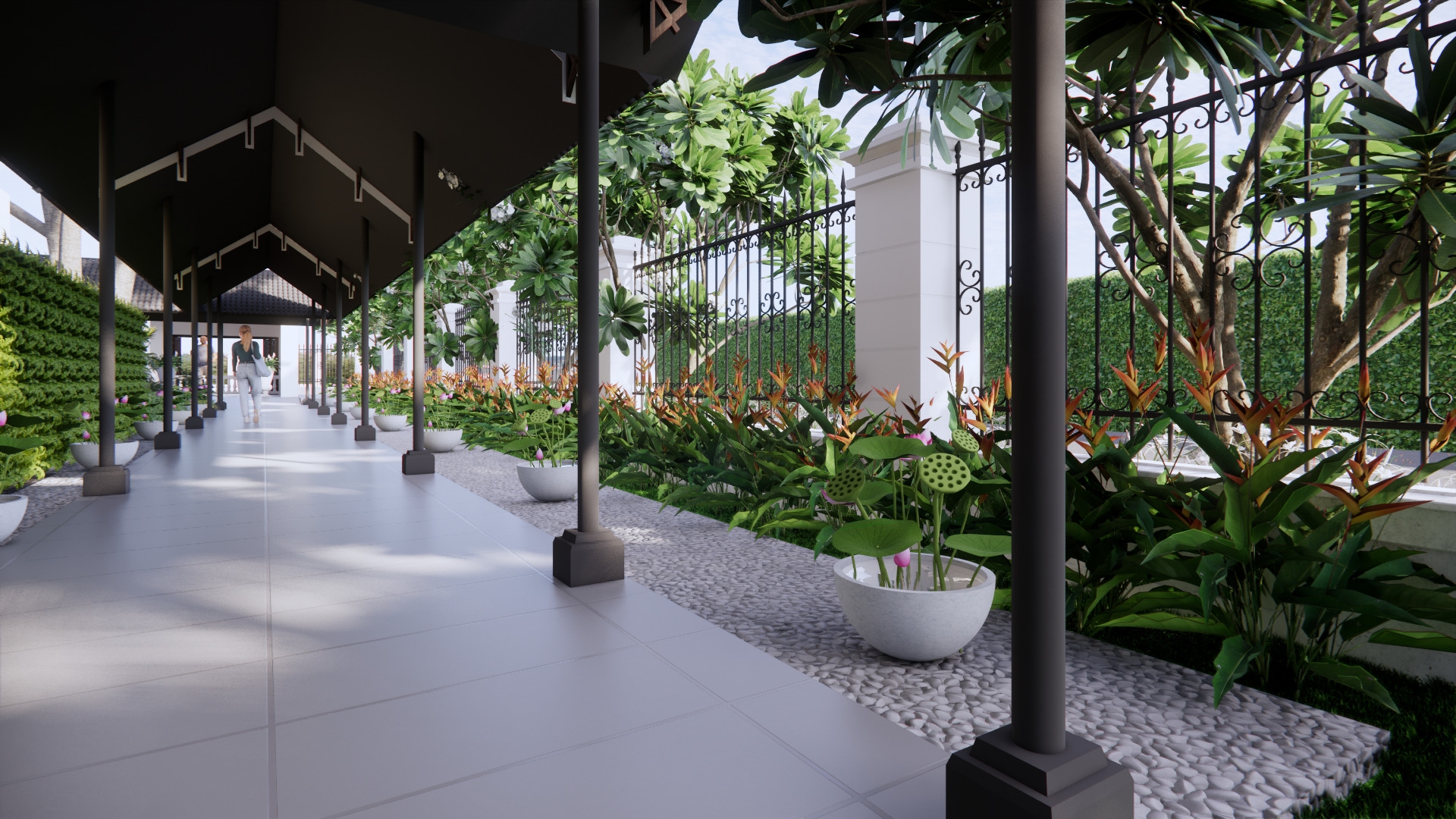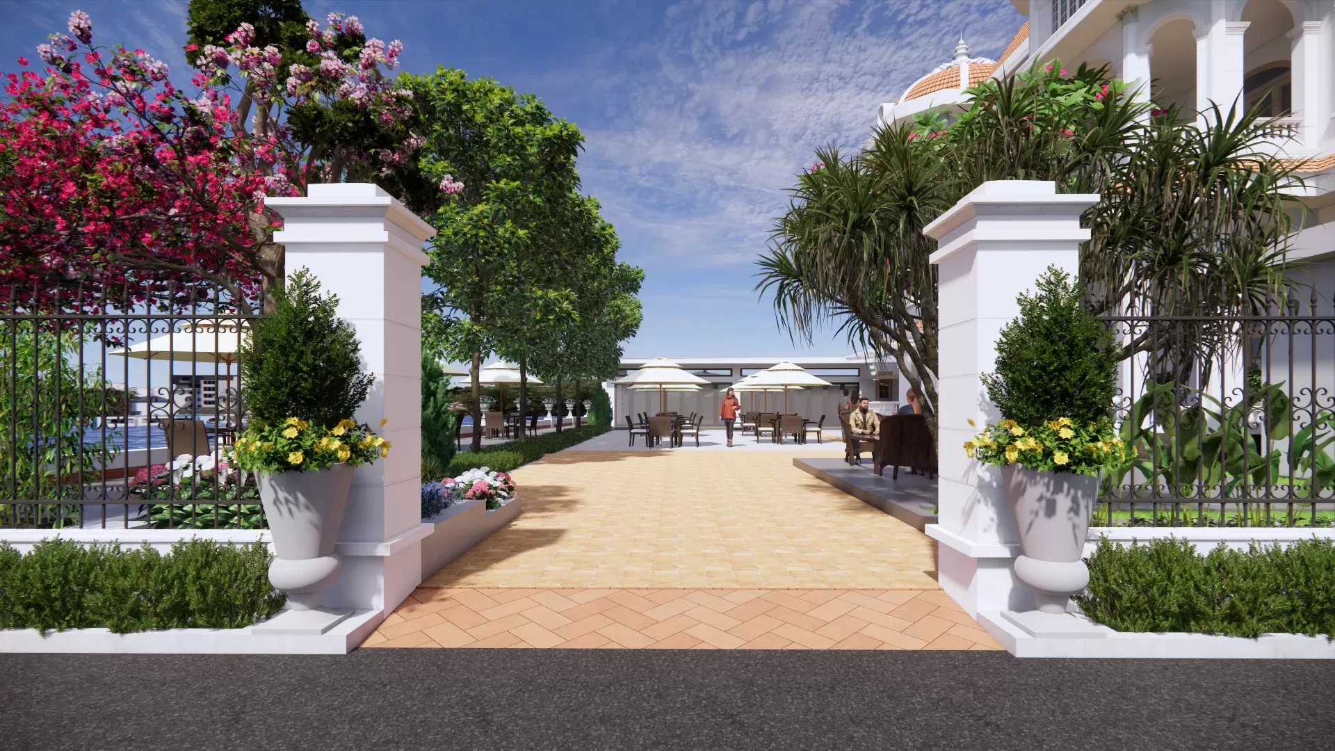 Ý tưởng thiết kế cảnh quan Nhà hàng Villa Sông Sài Gòn được xây dựng trên tinh thần tôn vinh vẻ đẹp kiến trúc Đông Dương – nơi giao thoa giữa nét cổ điển châu Âu sang trọng và sự mềm mại, gần gũi của Á Đông nhiệt đới. Không gian sân vườn được tổ chức như một chuỗi trải nghiệm chuyển tiếp: từ cổng vào trang trọng với trục lát gạch ấm màu, hàng cây và chậu cảnh đối xứng tạo cảm giác quý phái; đến khu vườn dạo ven hông nhà với lối đá bước trên nền sỏi, tầng cây đa lớp mang sắc thái nhiệt đới đặc trưng Nam Bộ.